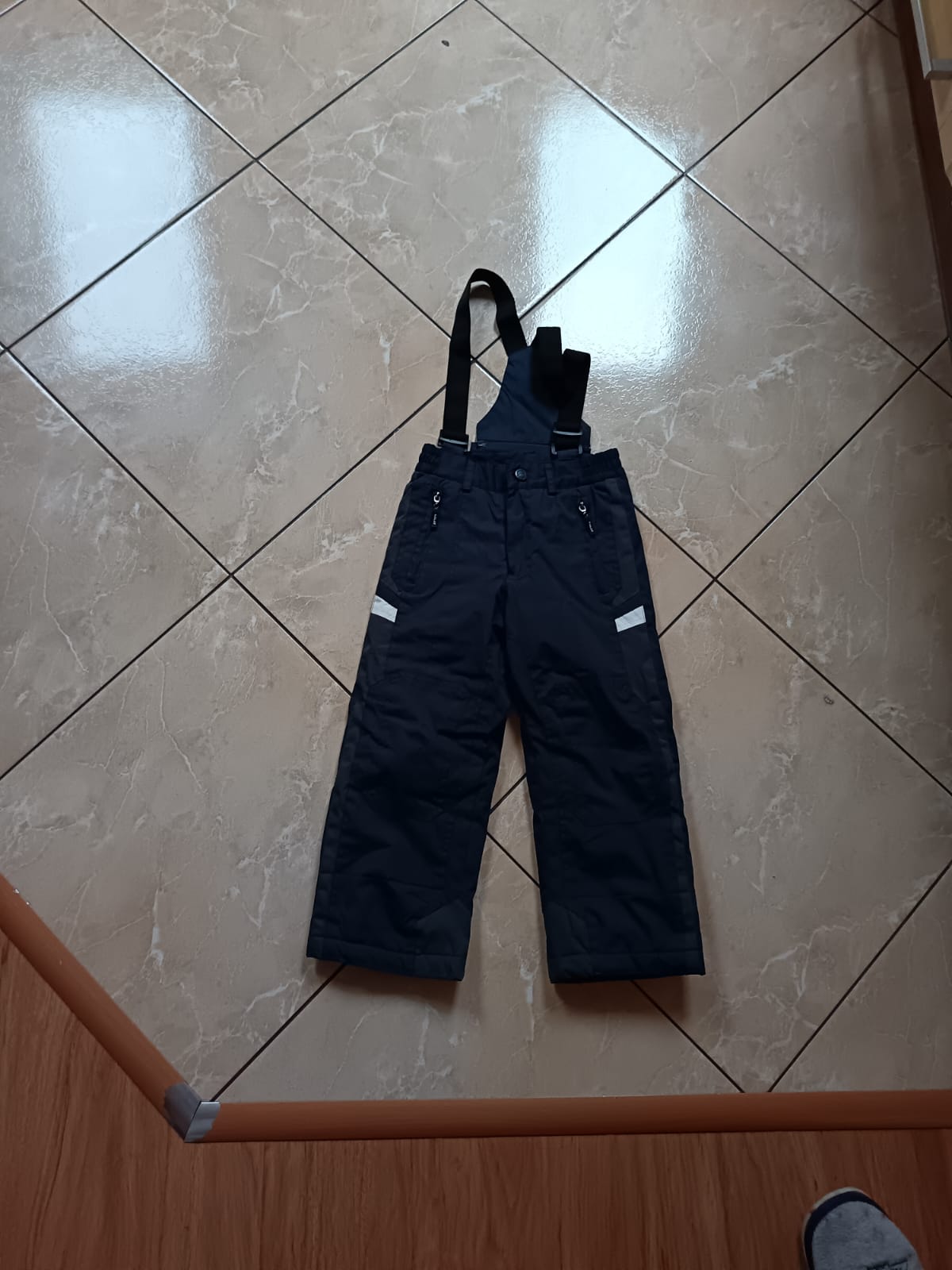 Nohavice sú ako oteplovačky. Sú nepremokavé, majú vyvýšený pás, ktorý sa dá regulovať, majú gumičky v spodnej časti nohavíc. Veľkost 103-112.