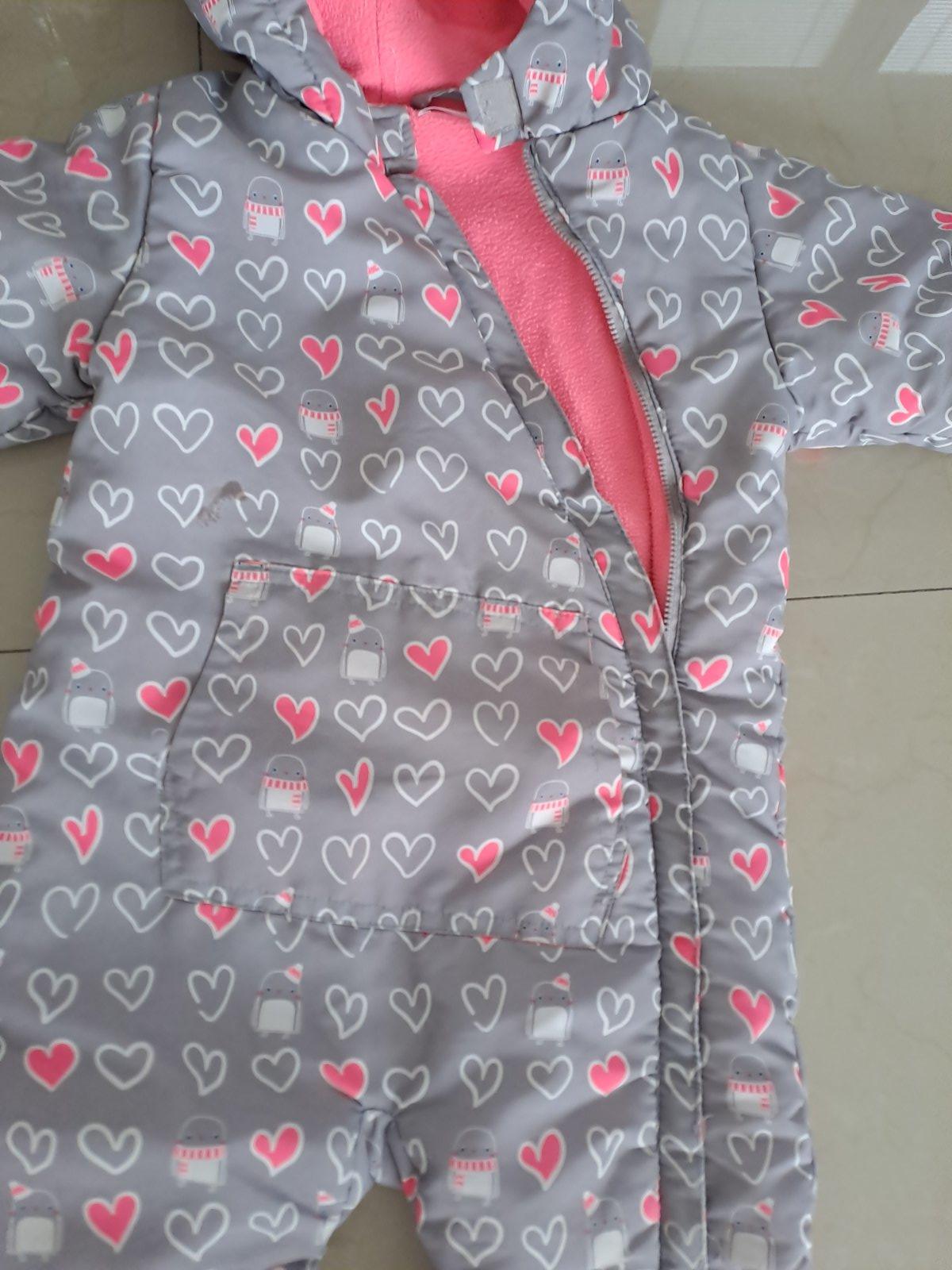 vrchny mat.sustiakovina,vnutro zateplene vatelinom,silonova podsivka,je v dobrom nosenom stave bez zavad,len z vnutra na nohaviciach suchnutie,nie poskodenie. vel.a zn.odstranena,ale nasa asi 92/98...