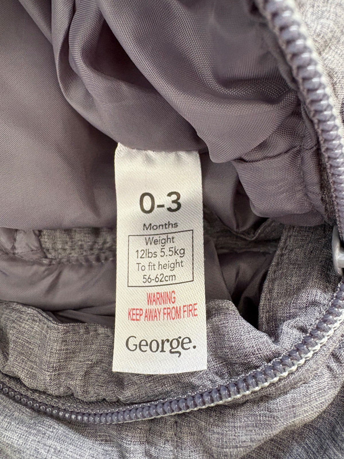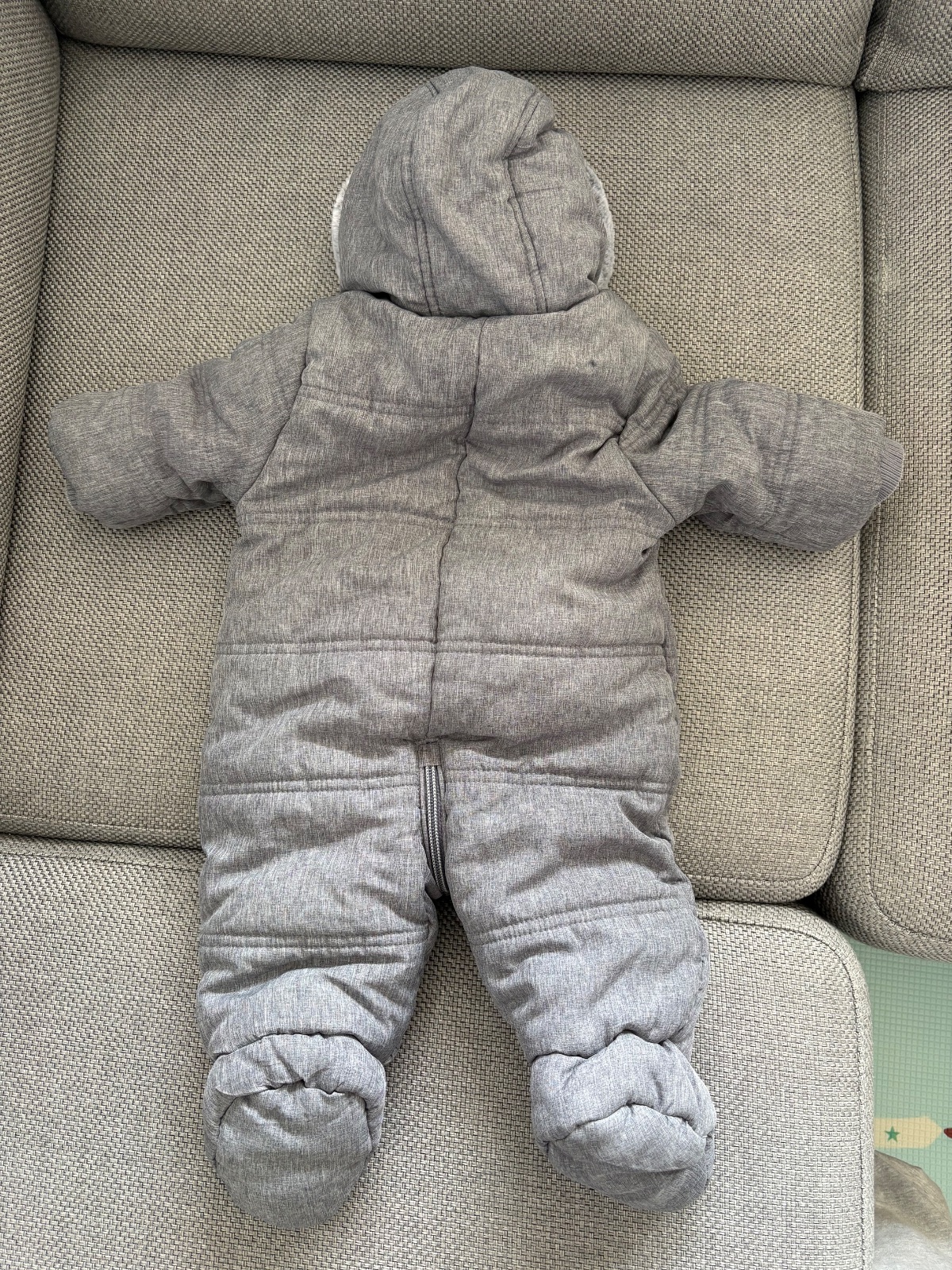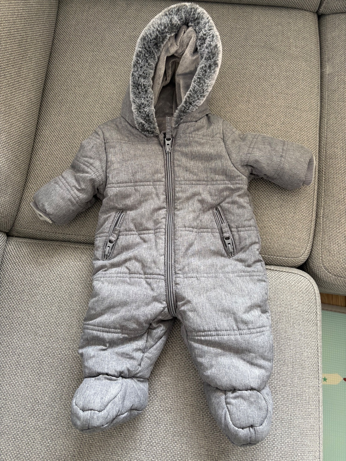 Predam 1x obleceny overal s makkou podsivkou v sivej farbe, zapinanie na zips. Velkost 0-3 mesiace.