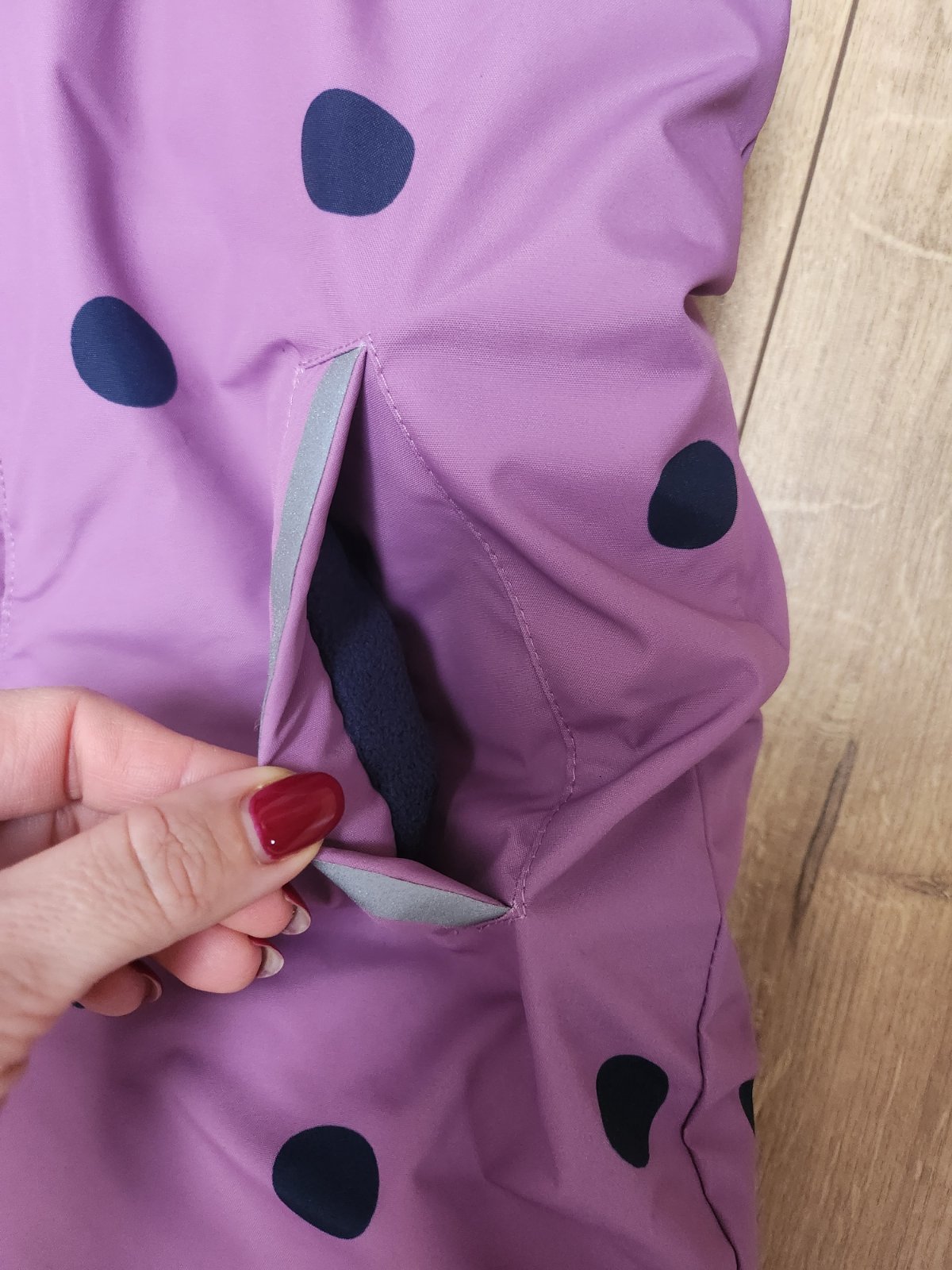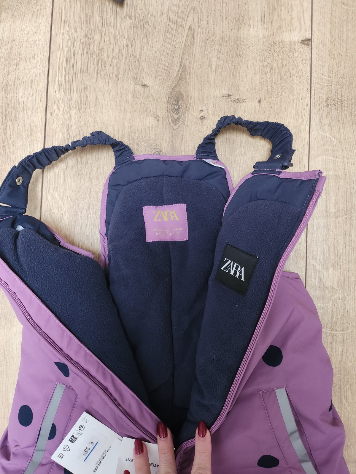 Krásne naozaj teple nohavice Zara ski collection, reflexné prvky, vpredu na zips, bočné vrecká. Farba medzi ružovou a fialovou.