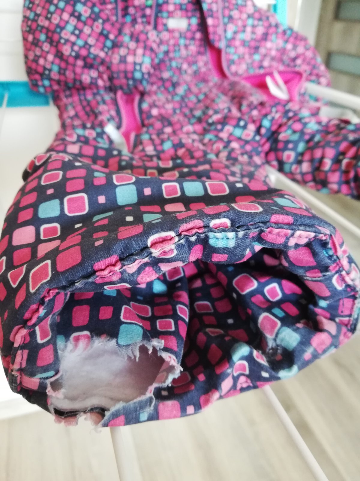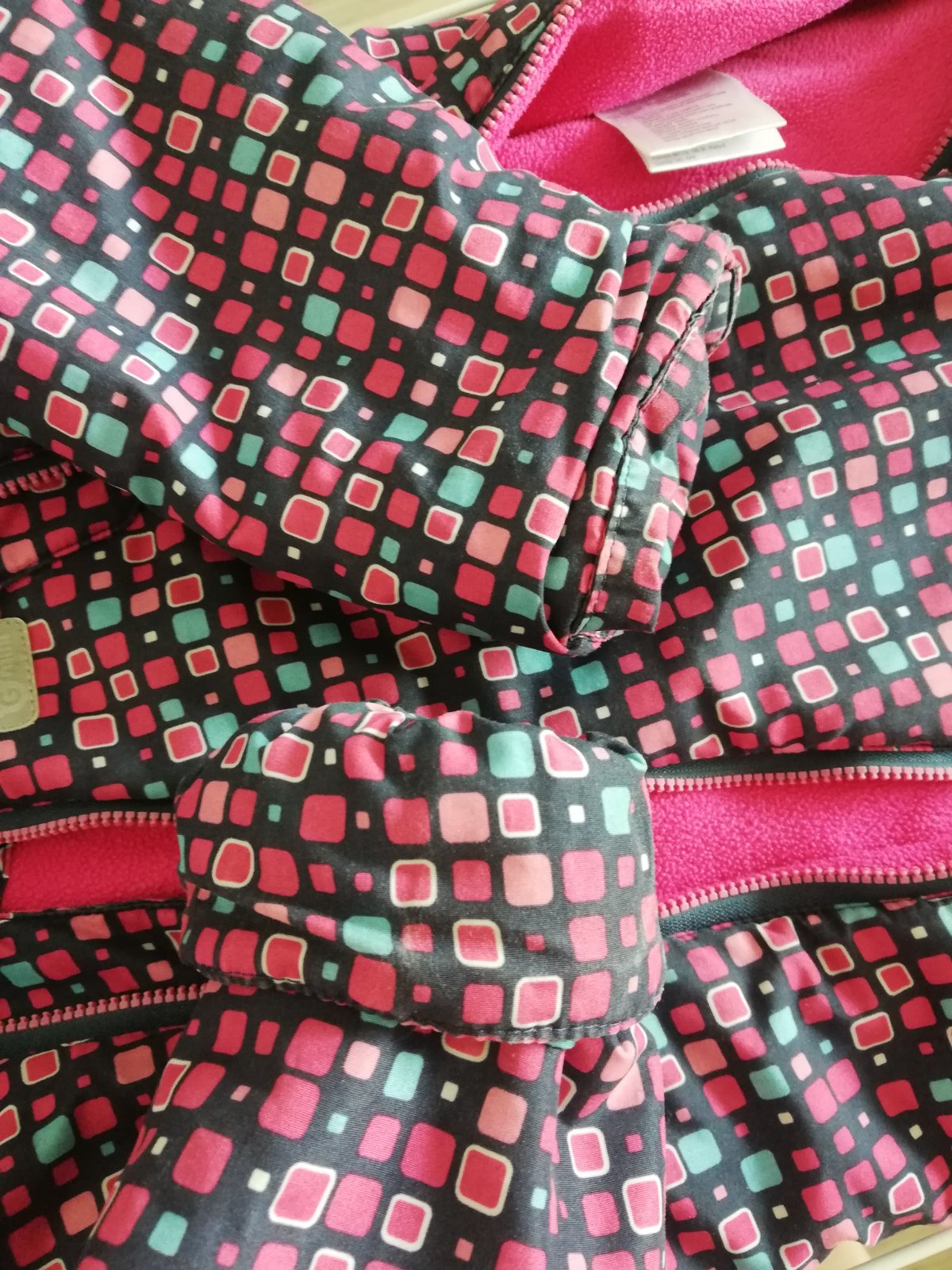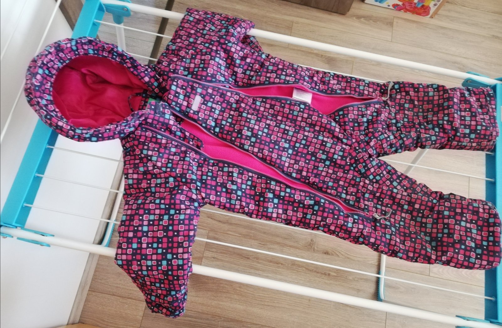 Predám málo používaný dievcenský overal na zimu. Ružovo červenej farby, s odnímateľným návlekmi na nôžky a gumičkou na nôžky
