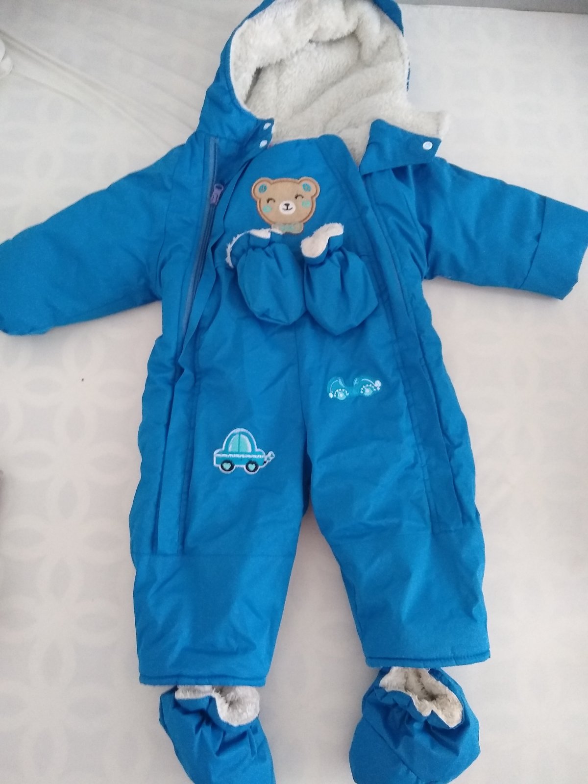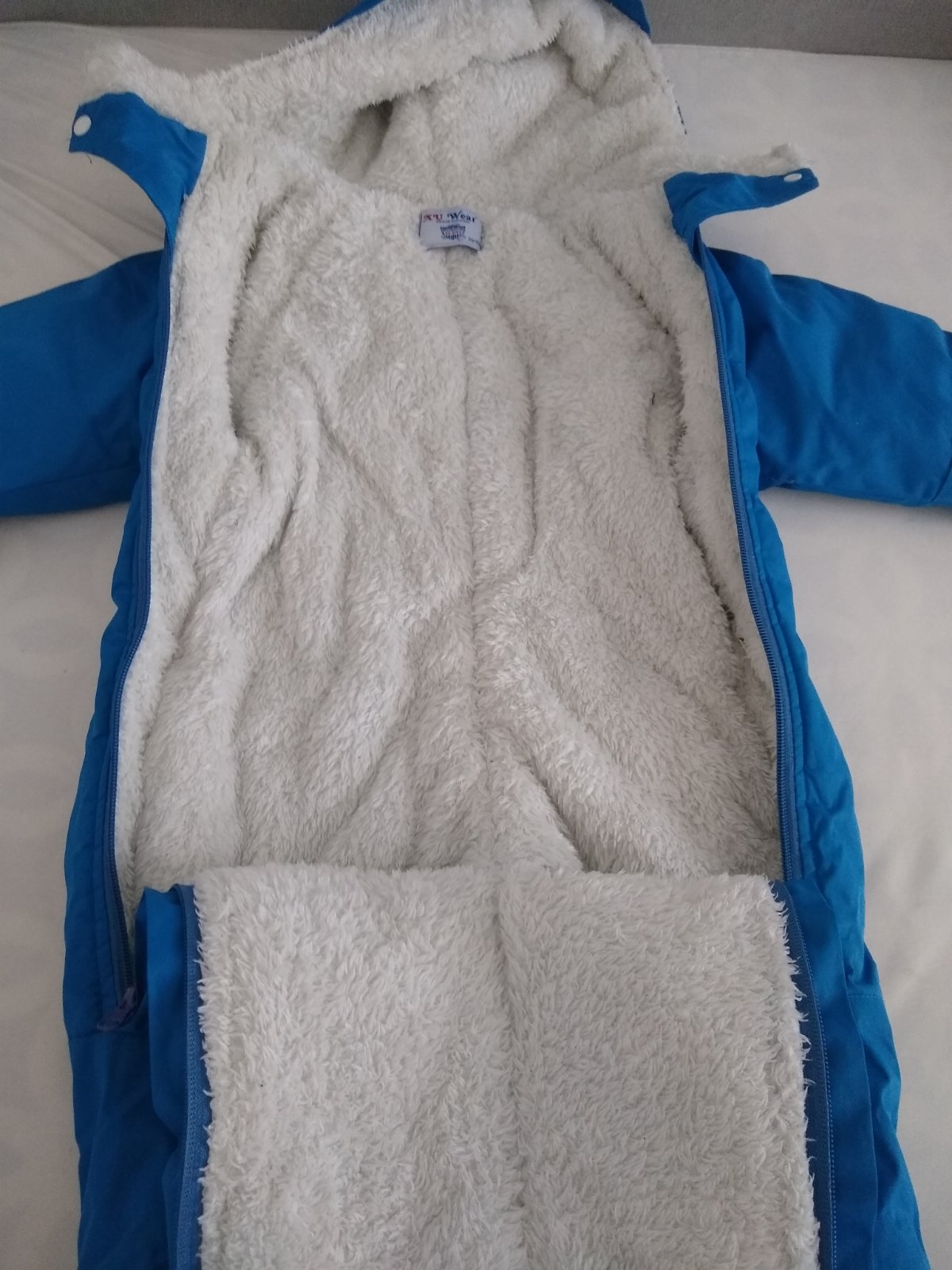 Krasny megateply zimny modry overalik, rucky zatvaratelne, pripnute rukavicky, aj na nozicky take zateplene "topanocky". Zasity pod pazuskou, inak super. Velkost je uvedena na 3 roky ale sedi tak na 1 rok.