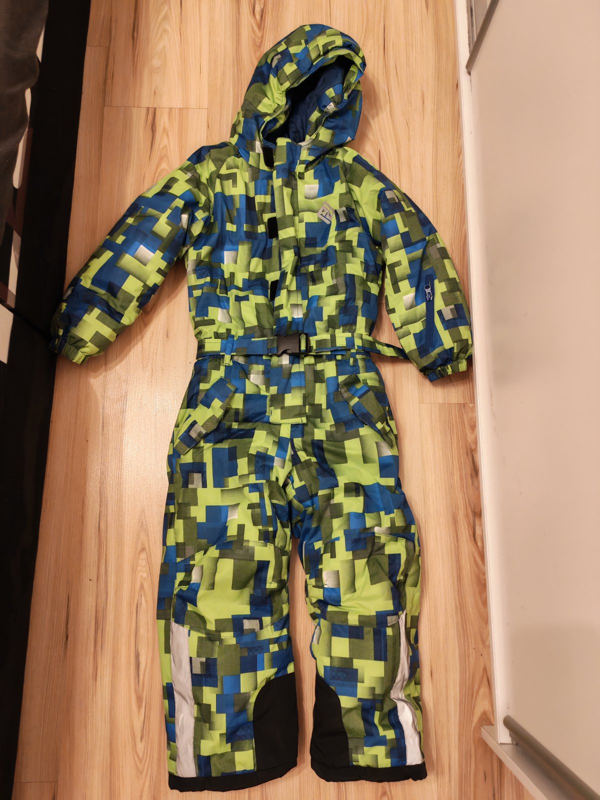 Zimná nepremokavá kombinéza s elastickým pásom. Rukávy sú zakončené elastickou manžetou. Zapínanie na zips a gombíky, šírka sa dá upraviť pomocou gombíkov vnútri obleku. Na prednej strane je vrecko...