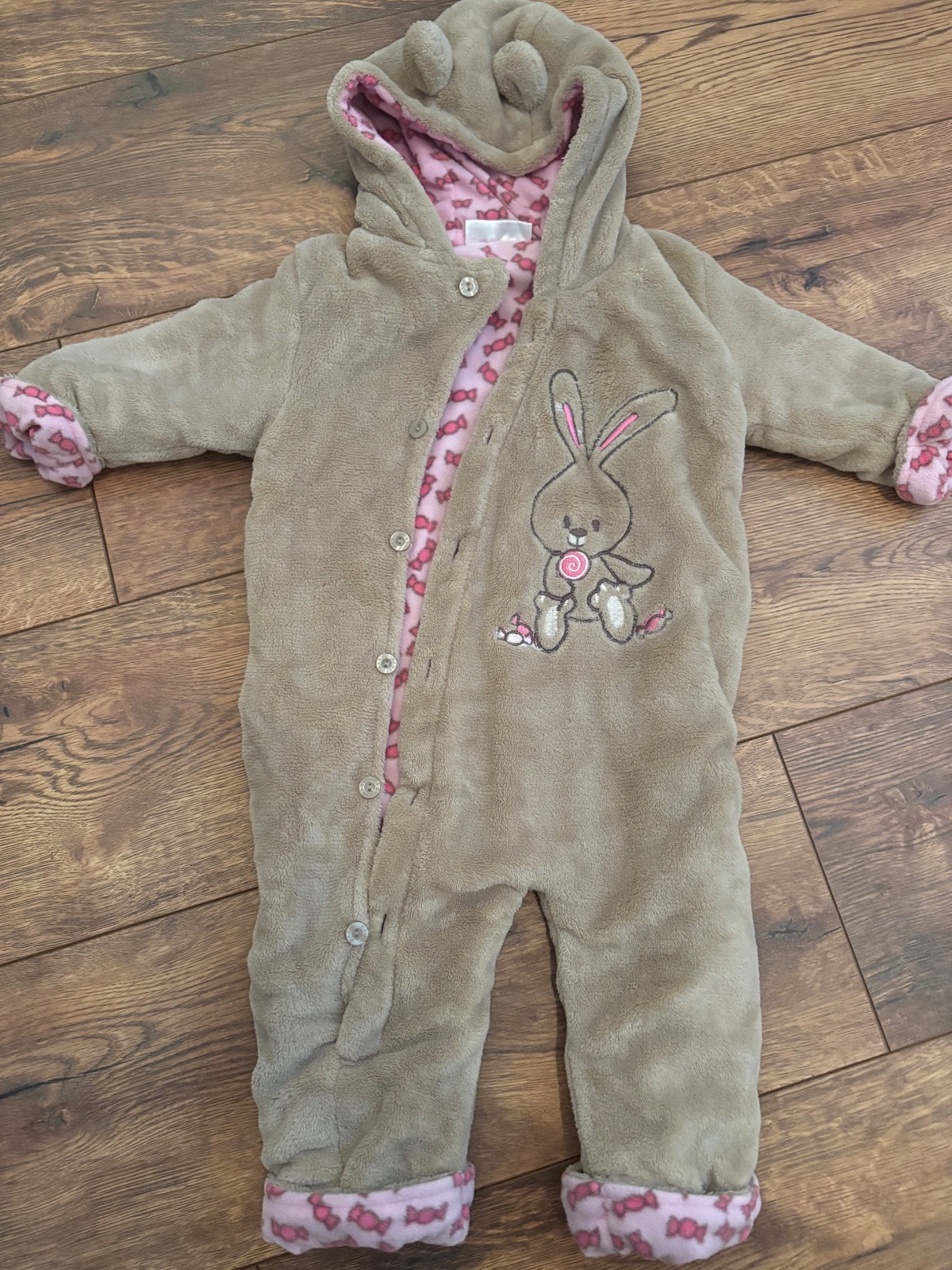 Teplý hunaty overal v bezchybnom stave, ruky sa dajú založiť, nožičky sú uzavreté, ponosite aj dlhšie.