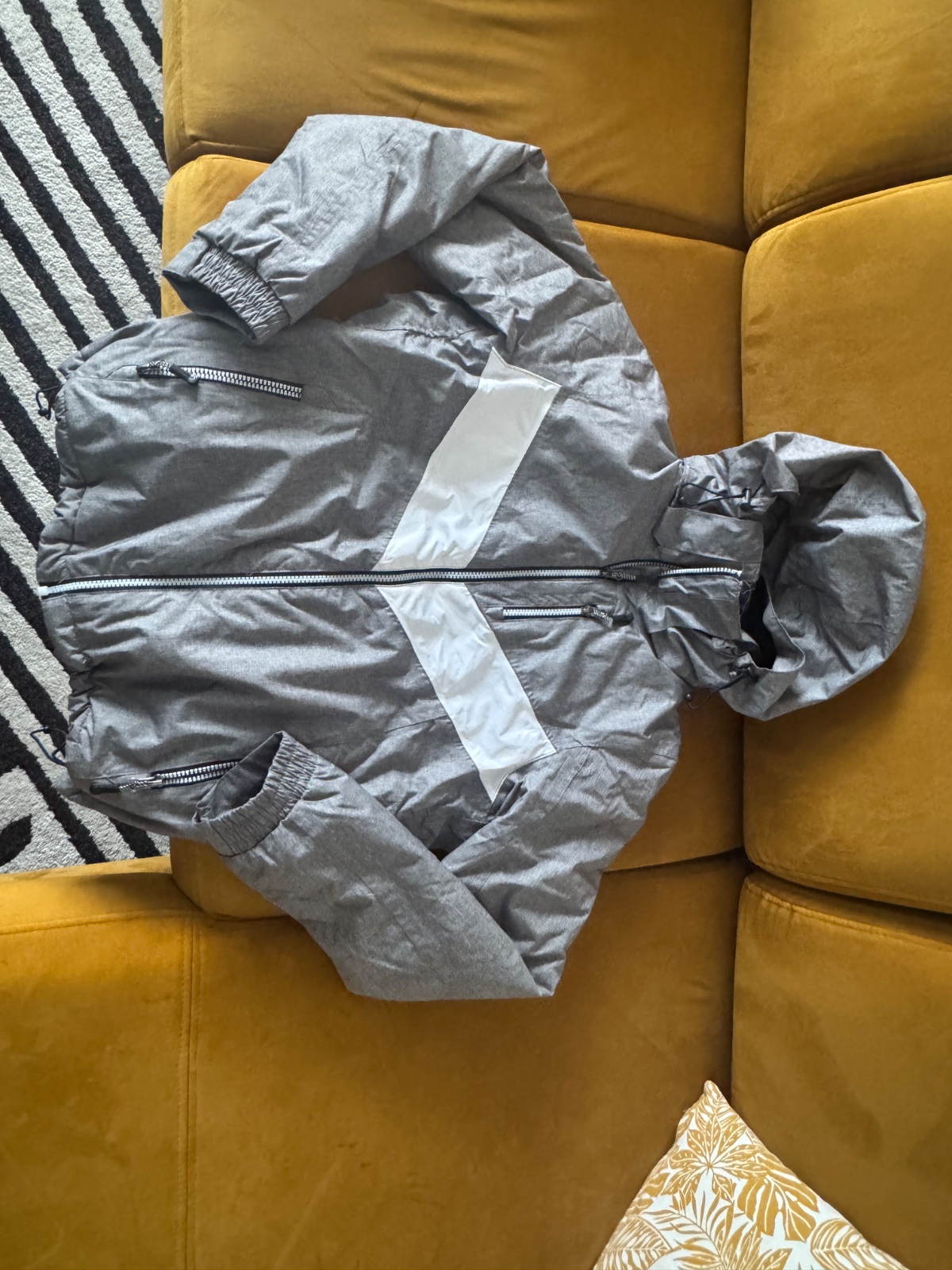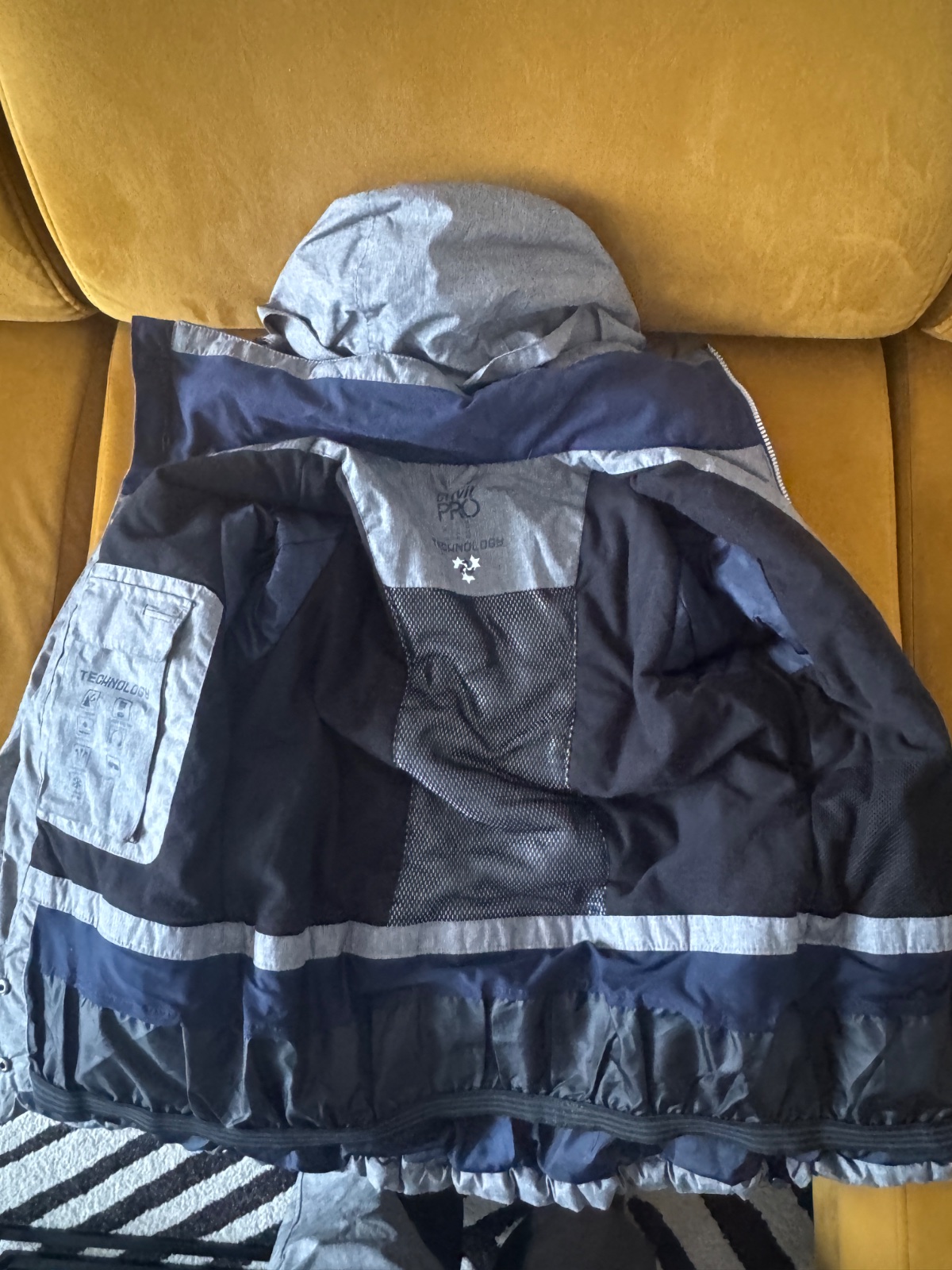 Veľkosť bundy: širka cez prsia 52 cm, dlžka 64 cm, dlźka rukáva 62 cm. Bunda má vetranie pod pazuchami na zips, kapsičky na zips, hrubý, priliehavý golier, vetruvzdorná, vodeodolná, príjemne teplá. Cena za komplet 16 € plus poštovné, ideálne packeta. Dá sa predať aj samostane