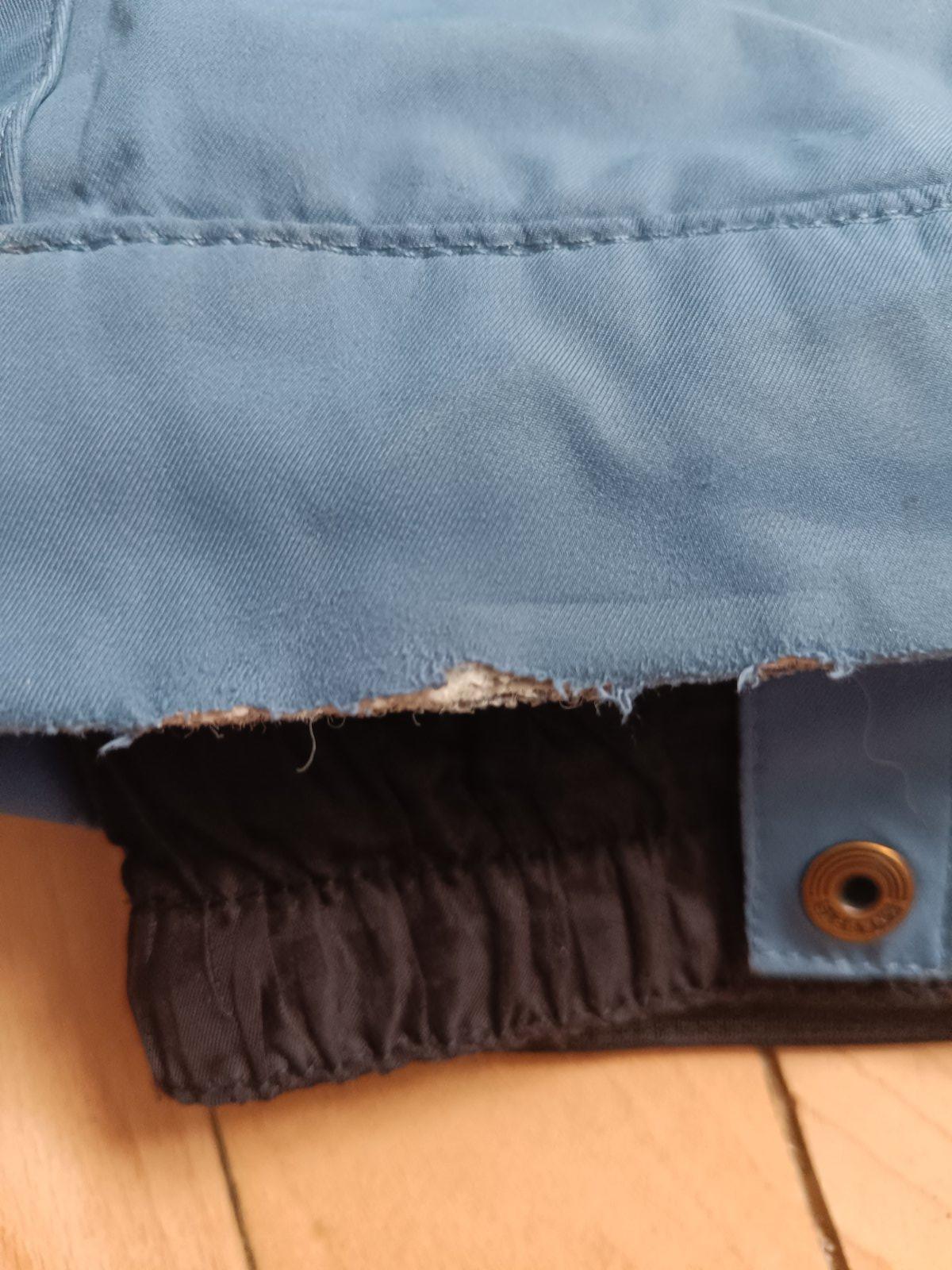 Oteplovacky takej peknej stredne modrej farby, su vo velmi dobrom stave. Pas sa da utiahnut alebo uvolnit, traky sa daju dat dolu. Maju 2 chybicky, 1 vzadu, odfotene, je to velmi mierne, a traky vz...