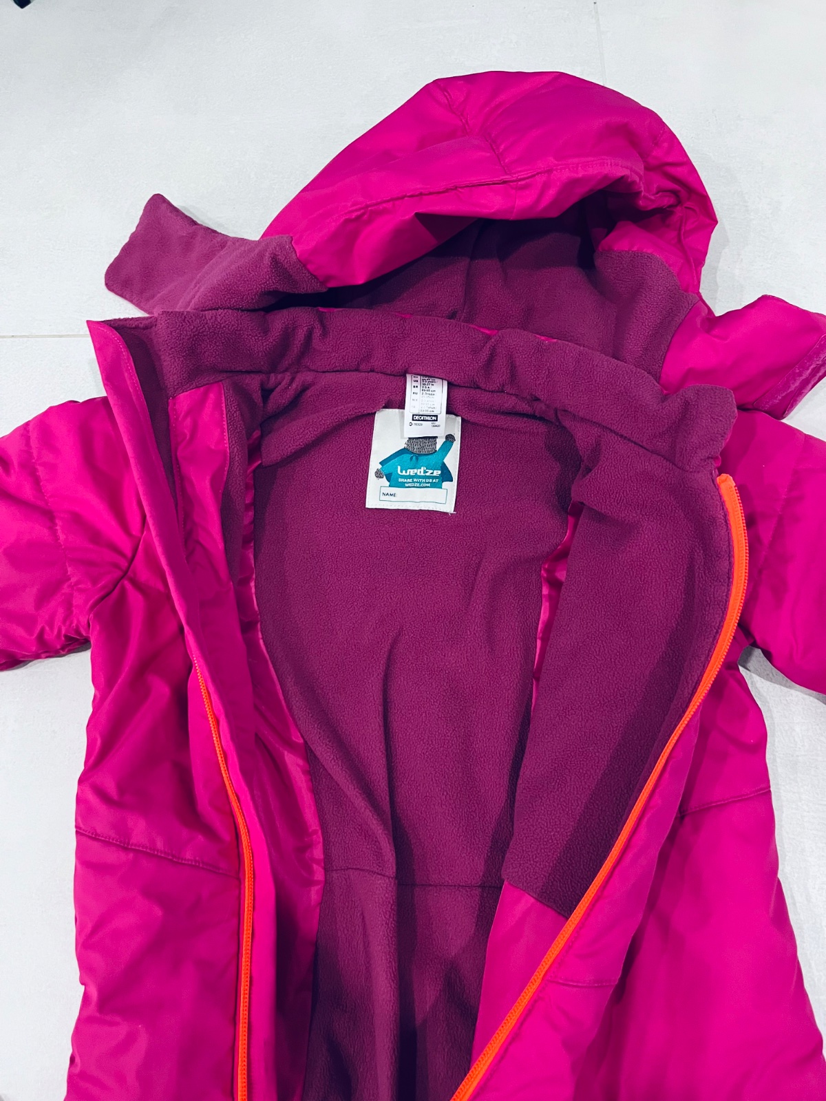 Krásny ružový overal . Má uz svoje chybičky ale ešte posluzi . Prvá chybička mini dierka na zadku niečím akoby pichnute a druhá chybička z vnútra pri nohe sa už pare ale dá sa to zašiť . Aj mamička...