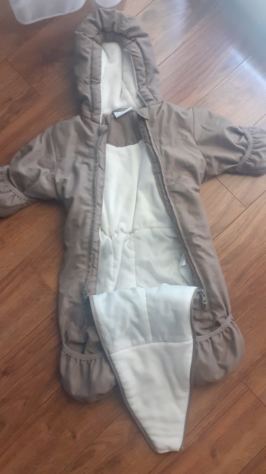 Zachovalá,ako nová. Nosená párkrát v kočíku. Rukavičky sú na gombík, dajú sa zložiť. My sme ich nepoužili vôbec. Podsita na chrbte bavlnou. Kupovaná v Tescu.