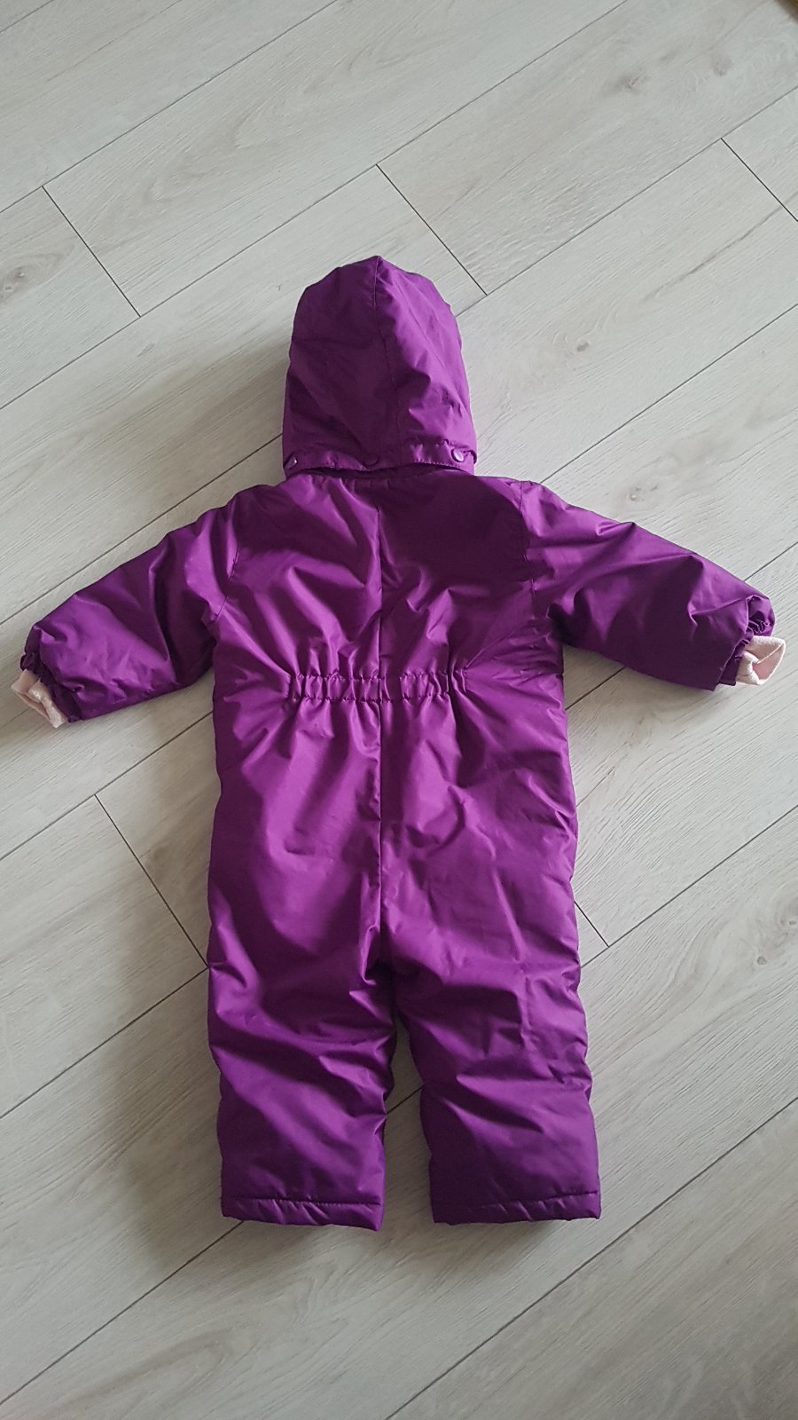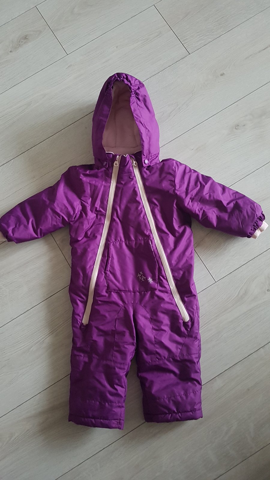 Pěkný zimní overal. Ruky a nožky se dají zakrýt. Žmolky na lemech, jinak bez vad. Velikost 74/80.