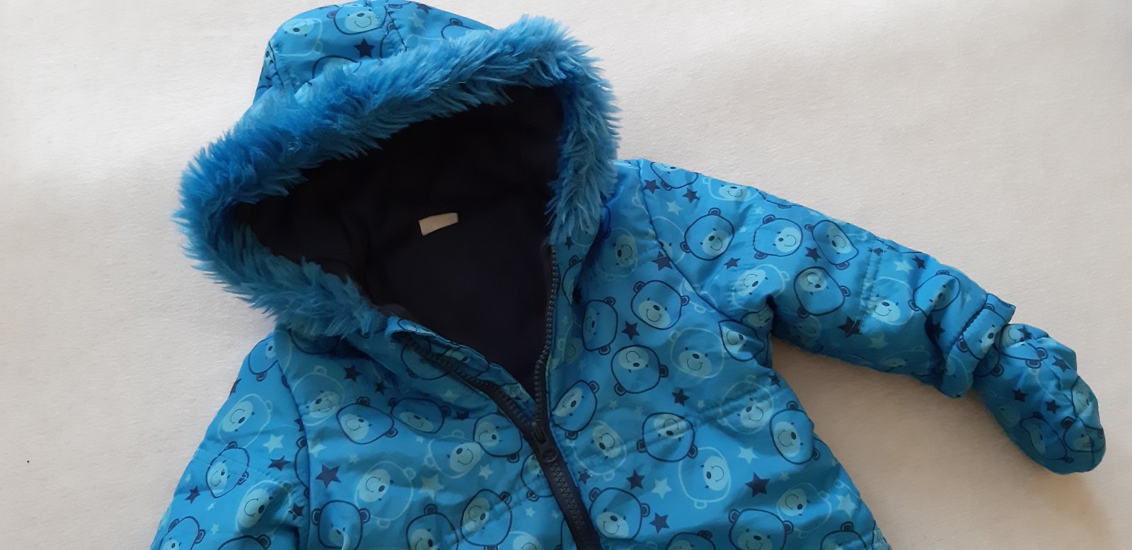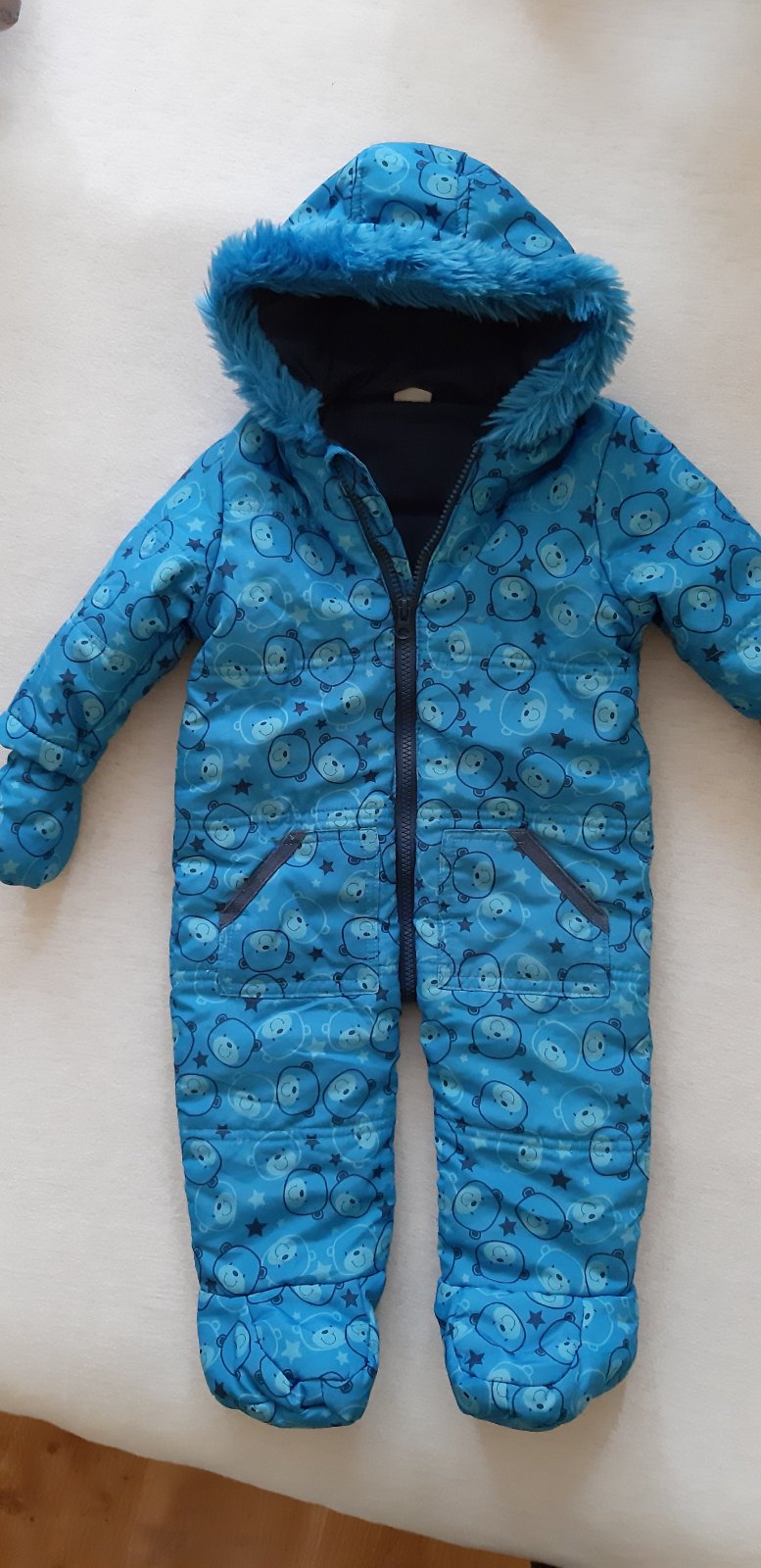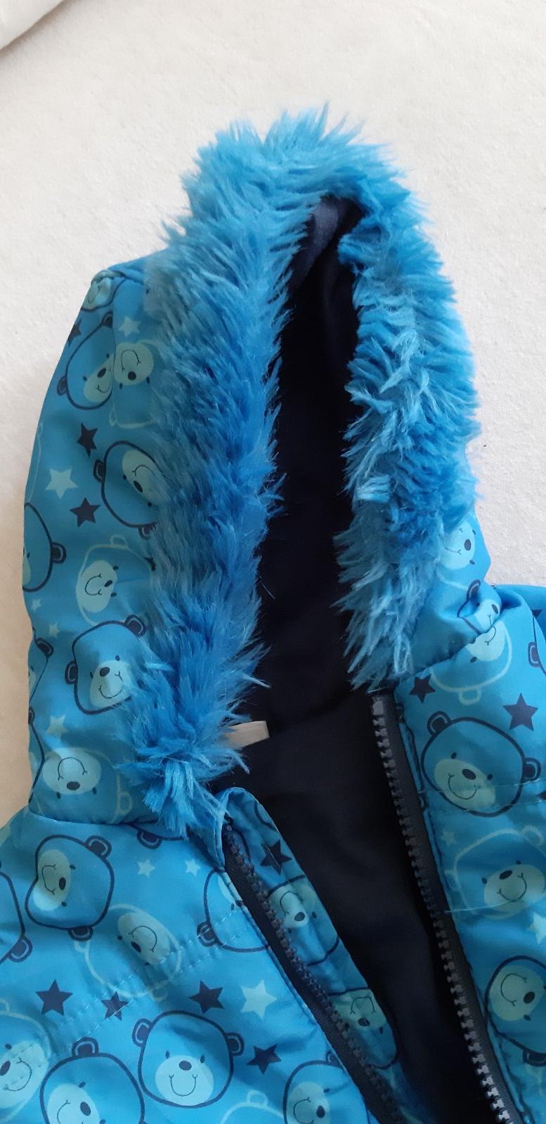 Modrá zimná kombinéza s rukavicami s teplou kožušinkou na kapucni, bez poškodení.