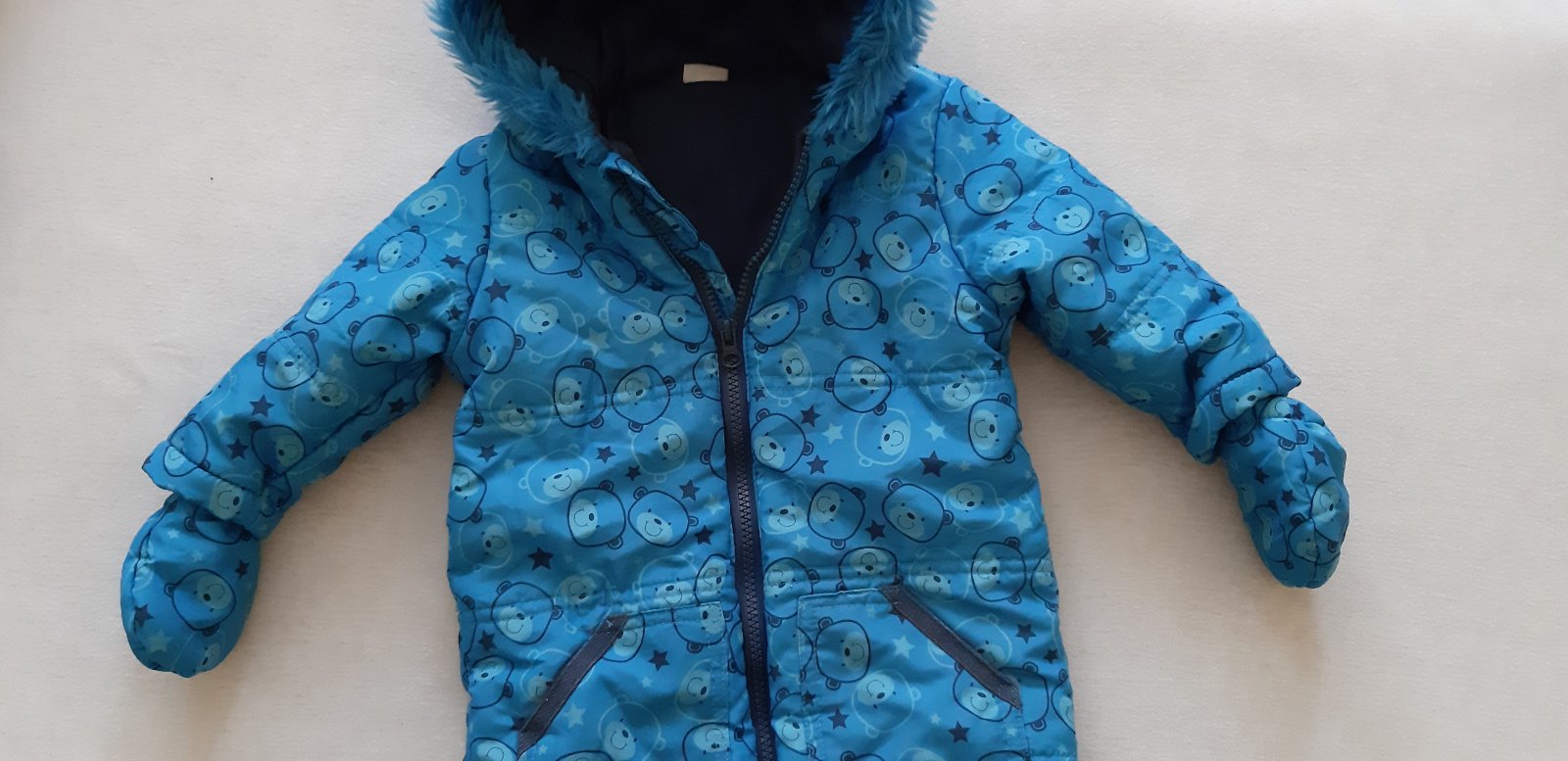 Veľmi teplá zimná kombinéza s ovečkou zateplením. Má aj rukavice. Veľkosť 6-9 mes.