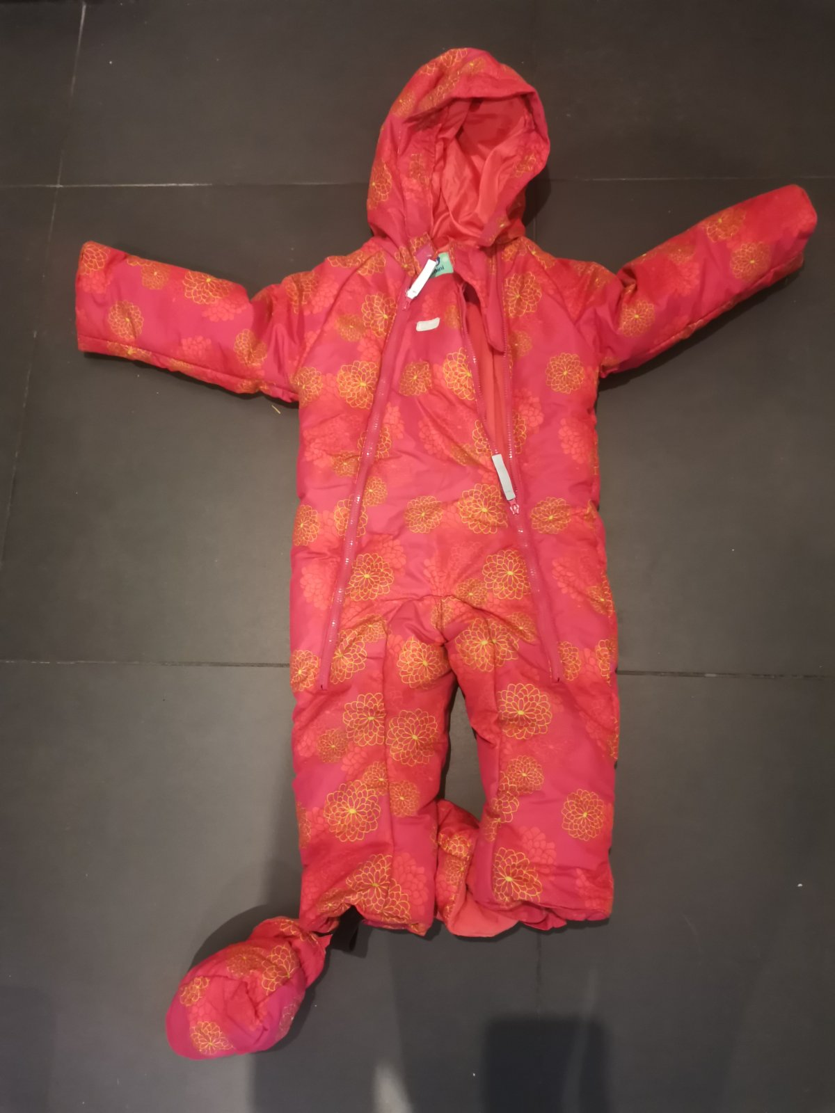 Krásny overal od prvých 1 krôčkou,farebný,ale do kočíka,na sane,ale na suchú zimu,jeseň.nie je to nepremokavé,do takého stýlu, žeby sedelo bábo hodinu v snehu.ale keby pršalo na saniach,tak vydrzi....