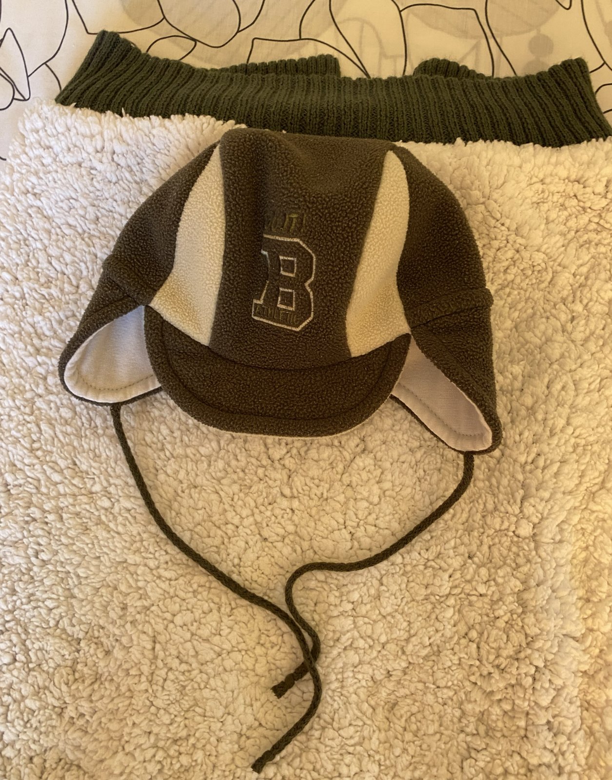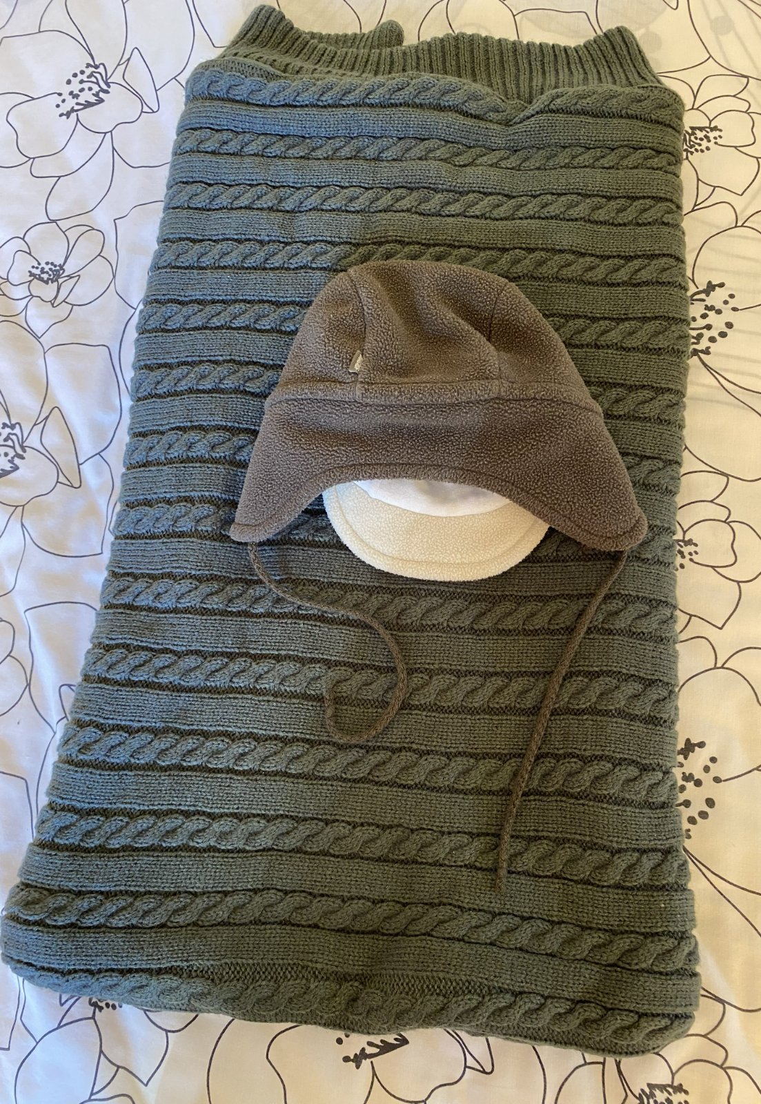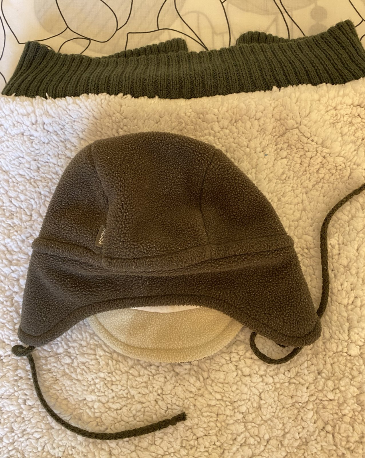 Teplý vak kožušinka - pletenina - vrchný materiál pružná mäkká pletenina, pekná khaki farba, patenty v dvoch vrstvách, z vnútornej strany biela mäkká umelá kožušinka. Miery merané z vnútornej strany v kľude - materiál je pružný, všade povolí: dĺžka bez patentu: 63cm + 7cm patent - 2 vrstvy, šírka: 43cmx2 + teplá čiapka so šiltom MAGROF - (POLARCAP - výhradný dovozca pre ČR a SR), materiál 98% bavlna, 2% elastan, vonkajší materiál jemný mäkký flis, z vnútornej strany podšitá bavlnou + malé množstvo elastanu, kombinácia farieb khaki zelená - béžová, v top stave. Miery: OH písaný 51-53cm, výška cez krytie ušiek: 21cm.