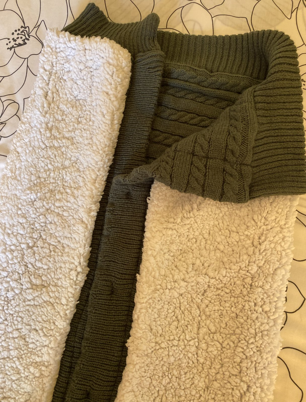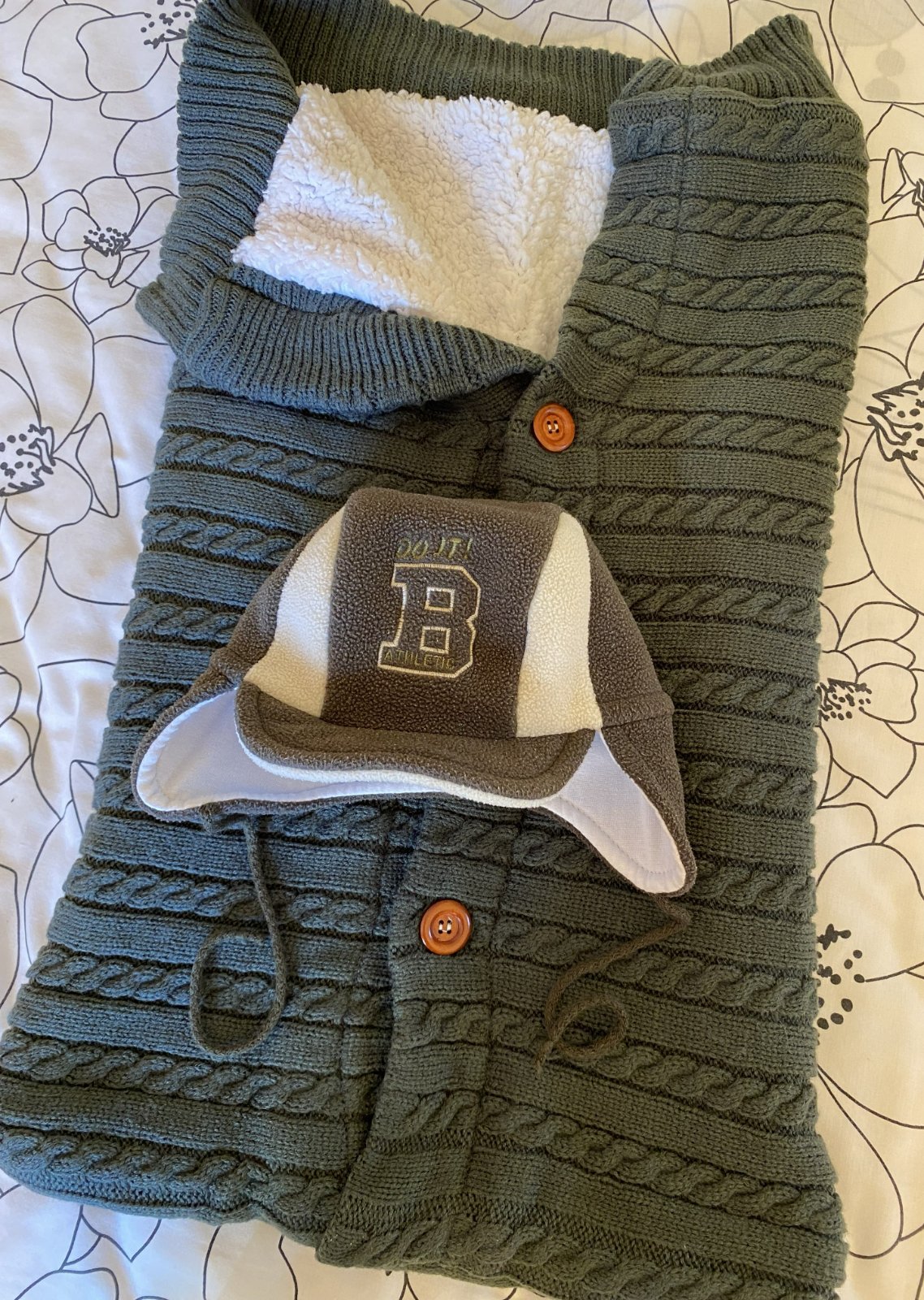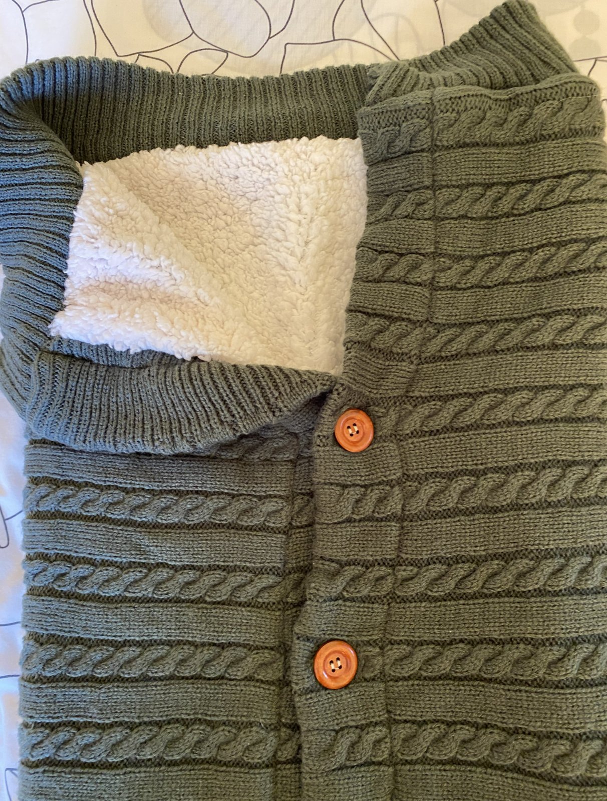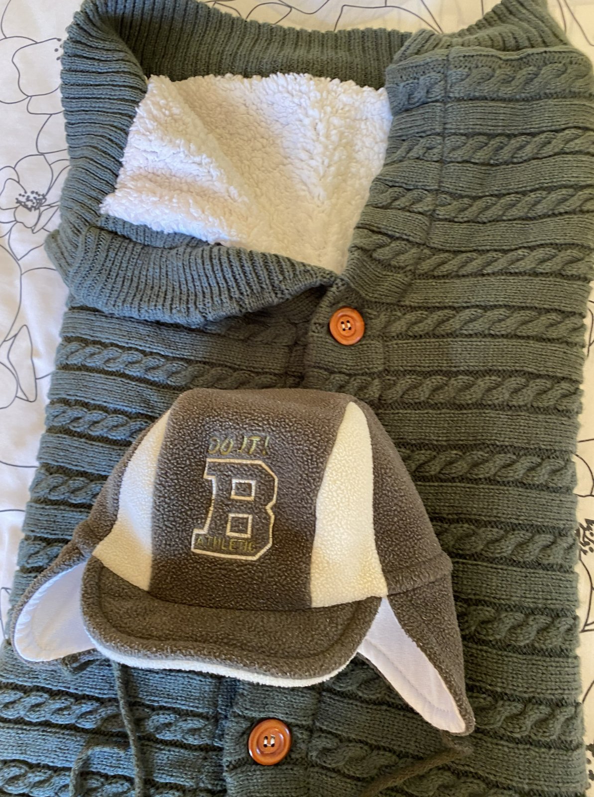 Teplý vak kožušinka - pletenina - vrchný materiál pružná mäkká pletenina, pekná khaki farba, patenty v dvoch vrstvách, z vnútornej strany biela mäkká umelá kožušinka. Miery merané z vnútornej strany v kľude - materiál je pružný, všade povolí: dĺžka bez patentu: 63cm + 7cm patent - 2 vrstvy, šírka: 43cmx2 + teplá čiapka so šiltom MAGROF - (POLARCAP - výhradný dovozca pre ČR a SR), materiál 98% bavlna, 2% elastan, vonkajší materiál jemný mäkký flis, z vnútornej strany podšitá bavlnou + malé množstvo elastanu, kombinácia farieb khaki zelená - béžová, v top stave. Miery: OH písaný 51-53cm, výška cez krytie ušiek: 21cm.