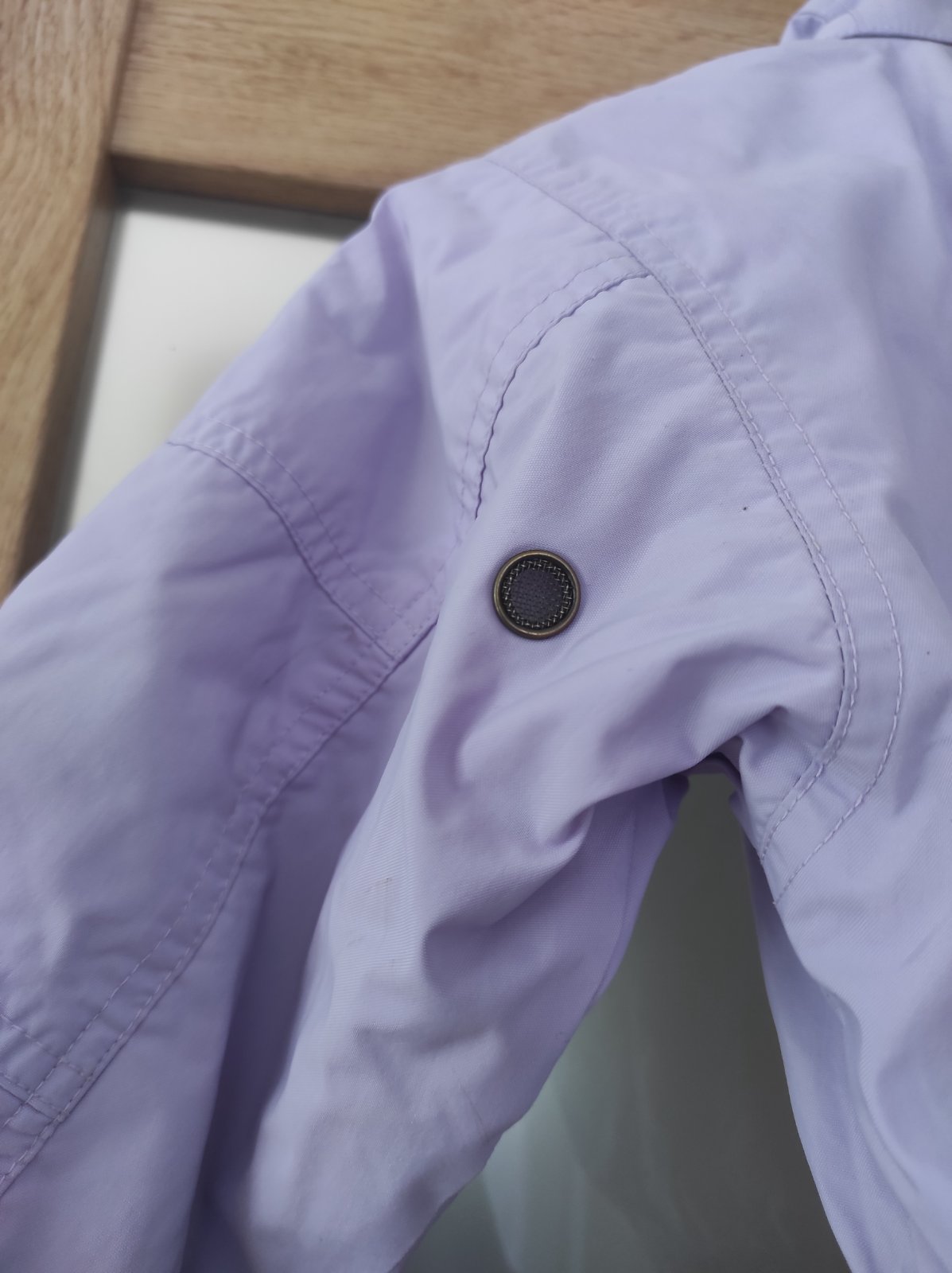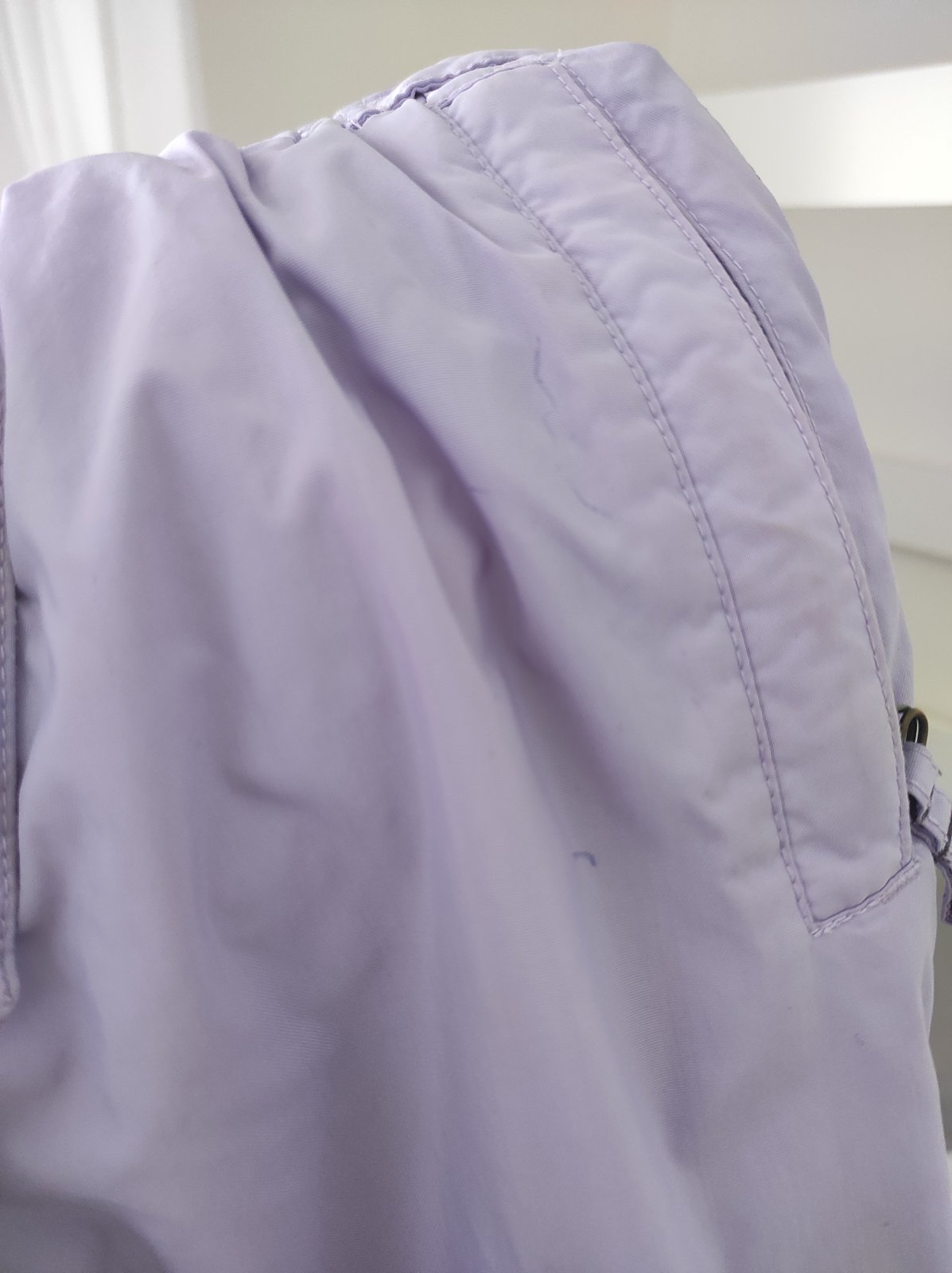 Chýba kapucňa, na dvoch miestach je trochu vidno popísané perom (neprala som kvoli tomu na vyssej teplote, ani som to nijak specialne neodstranovala, nam to nevadilo, pri noseni nevidno), na kolienkach jemne vysuchana farba (nic hrozne, pri noseni tiez nevidno). Všetko som sa snažila odfoťiť.
