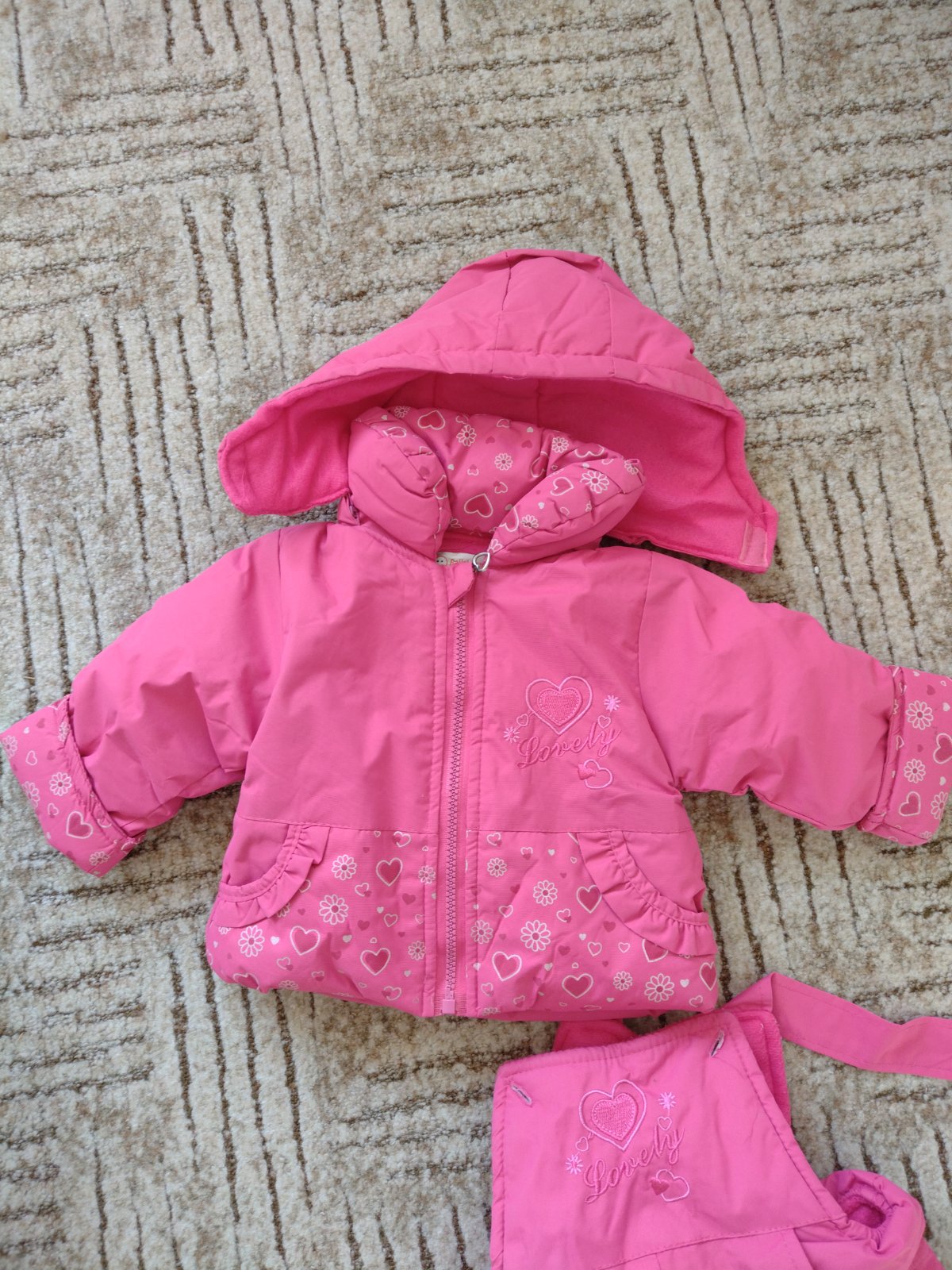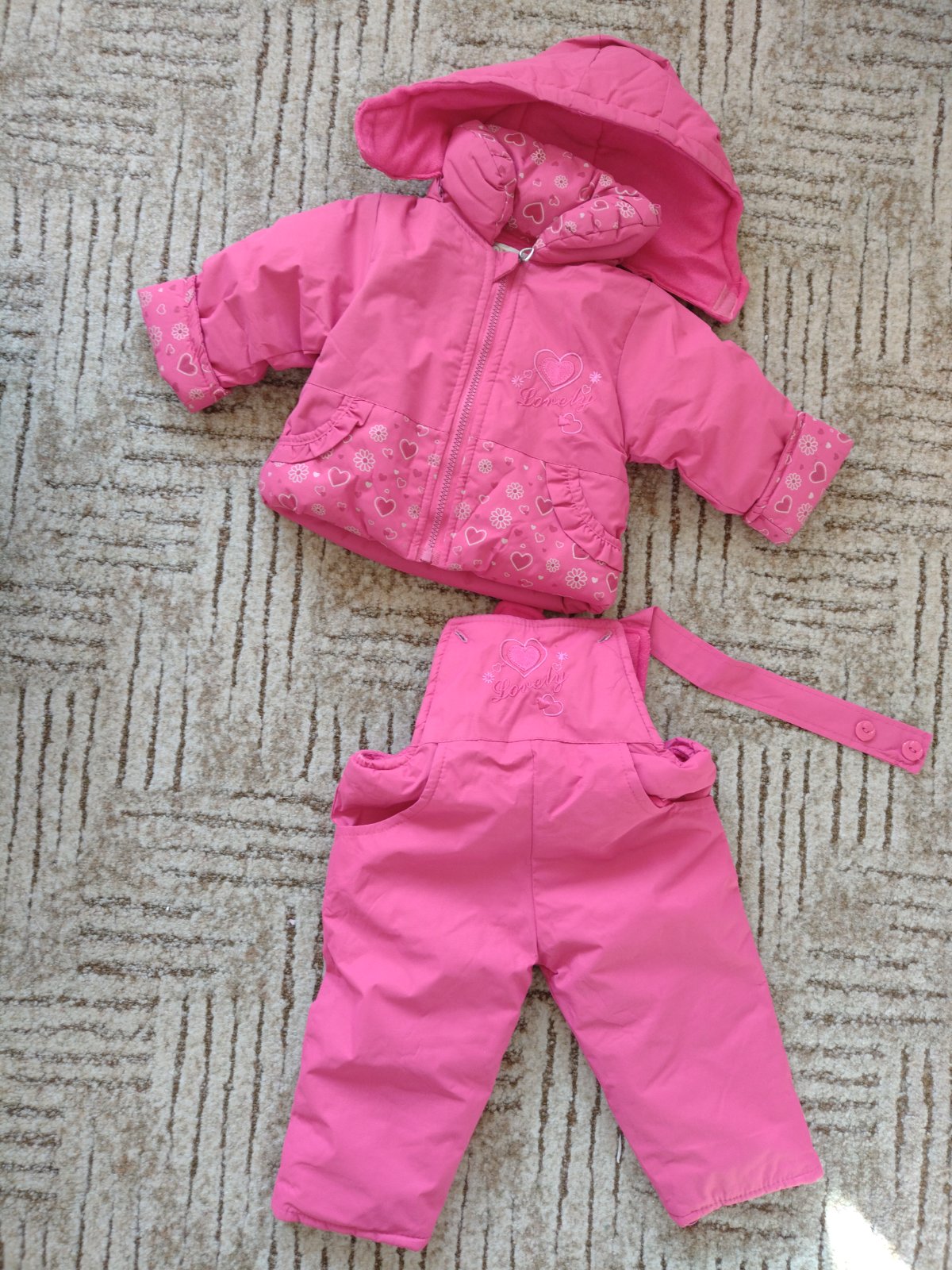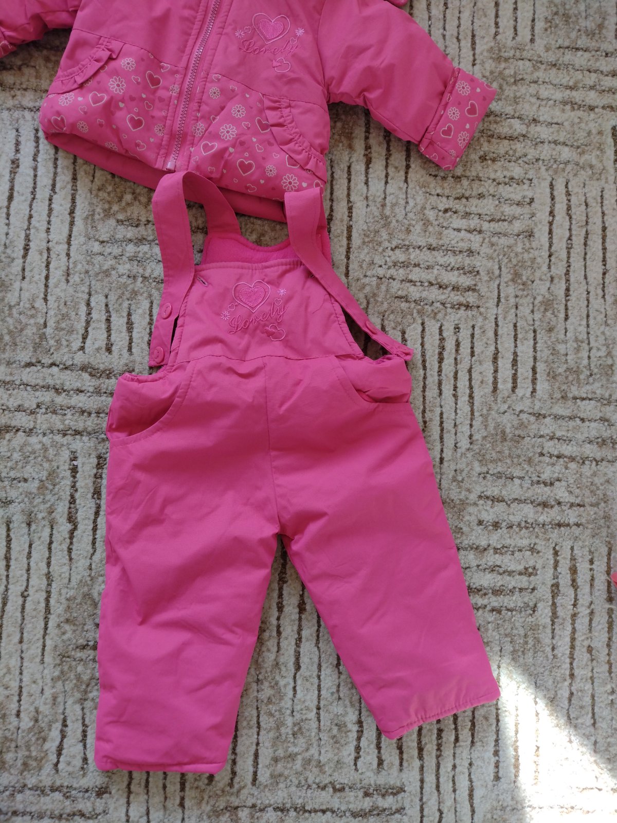 Málo používaná súprava, bez poškodení. Dĺžka rukáva 27 cm, dĺžka bundy 30 cm, dĺžka nohavíc od pása 39 cm.
