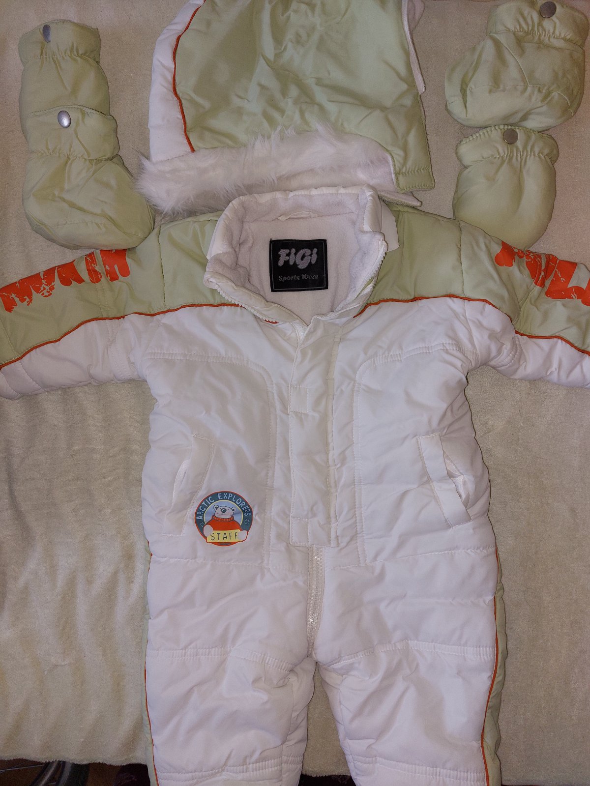 Ponúkam tento zimný overal zn. Ladybird, bielej resp. jemne smotankovej farby, vpredu s aplikáciou macka plyšového materiálu, s odopínateľnými rukavičkami, nožičky sú napevno, zapínanie na dva zips...
