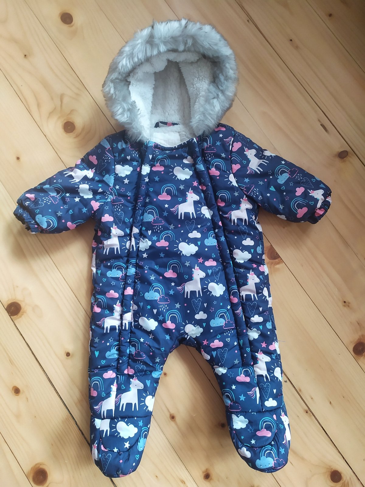 Zimný overal pár krát oblečený ako nový, žiadne poškodenie. Zapínanie na oboch stranách na zips, kapucňa pevná. Rozmery dĺžka 58 cm, ramená 22 cm, rukáv 21cm.