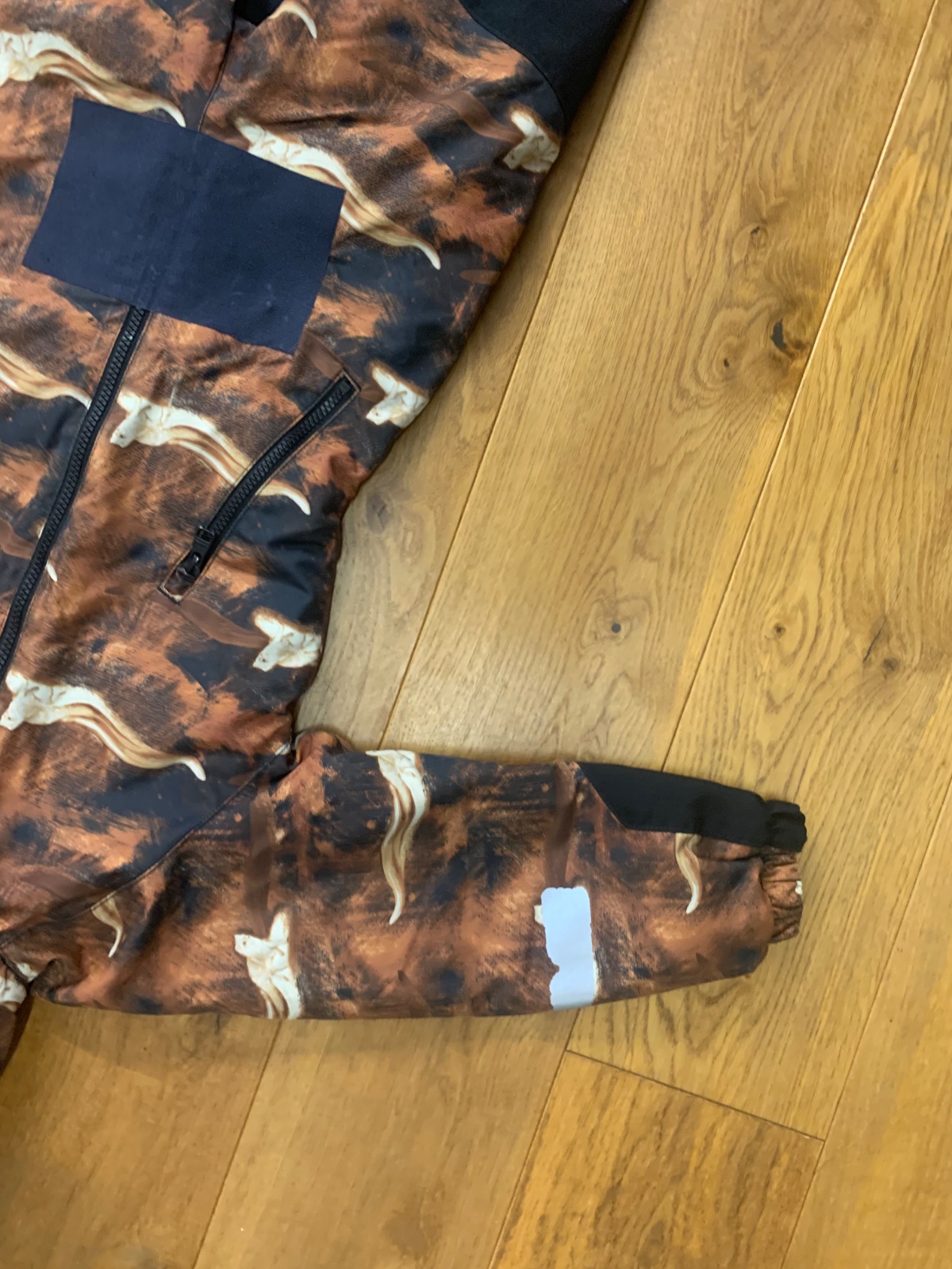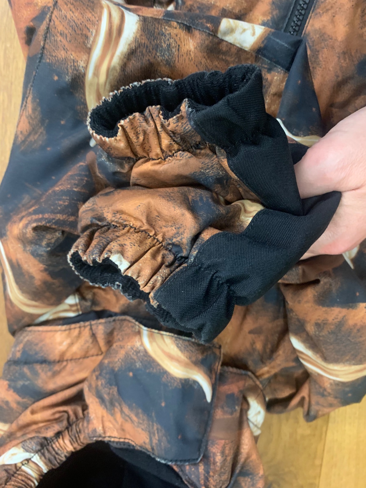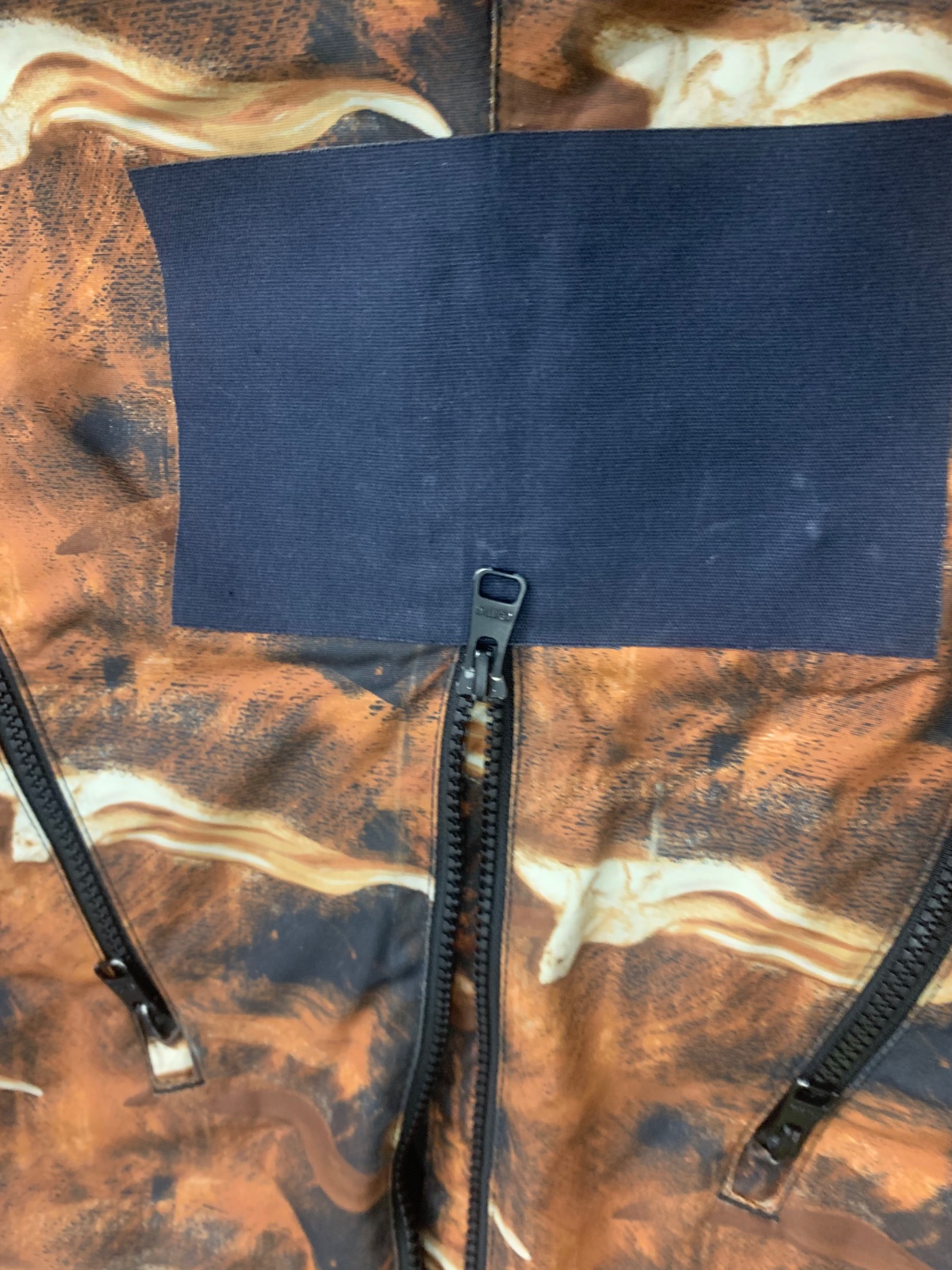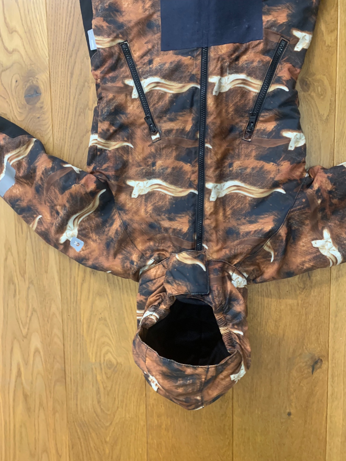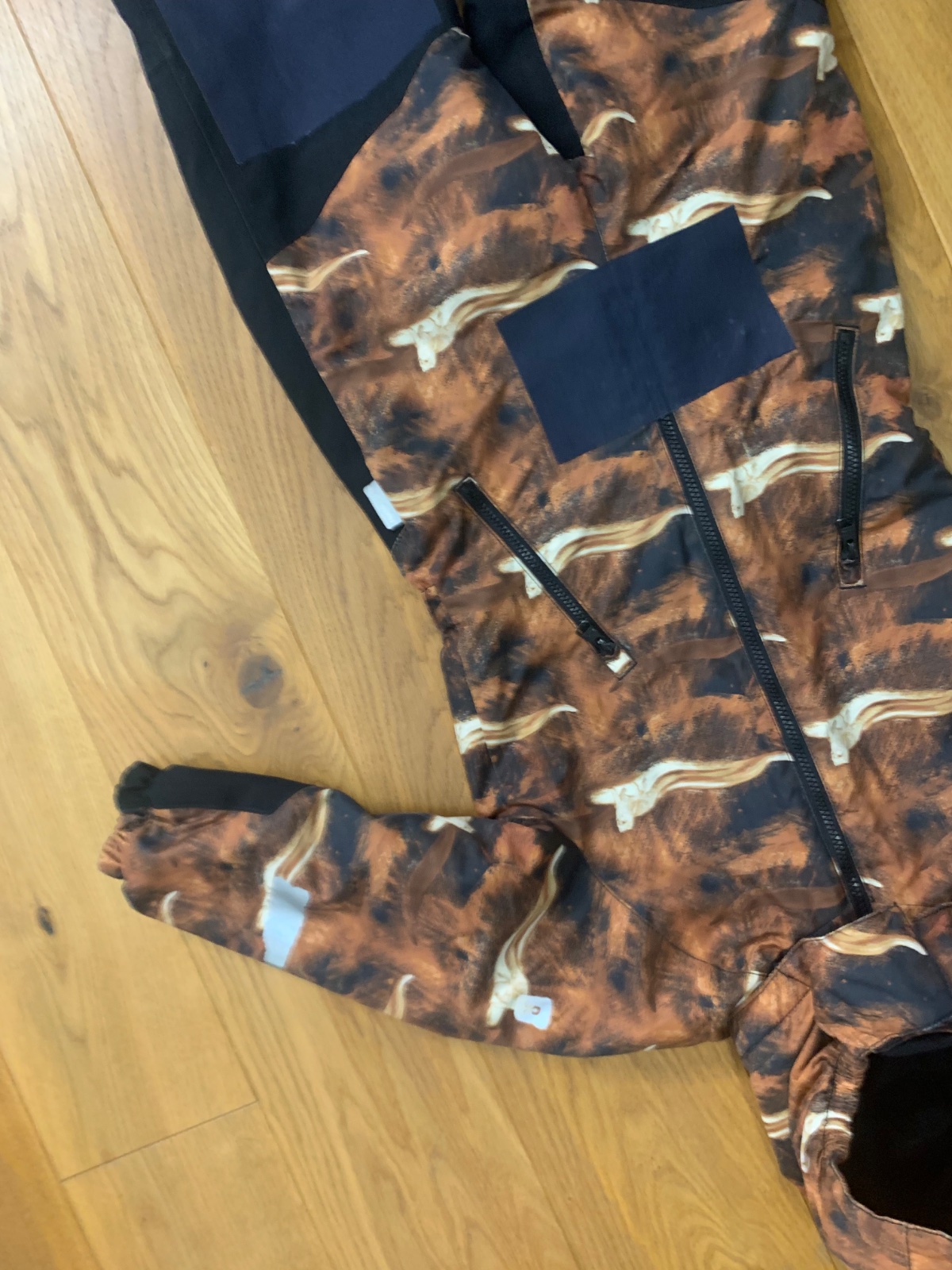 brucho, zips PLNE funkčný, skrátený záplatou o cca 5 cm, pretože syn sa v nej spúštal po ľadovci po bruchu.
