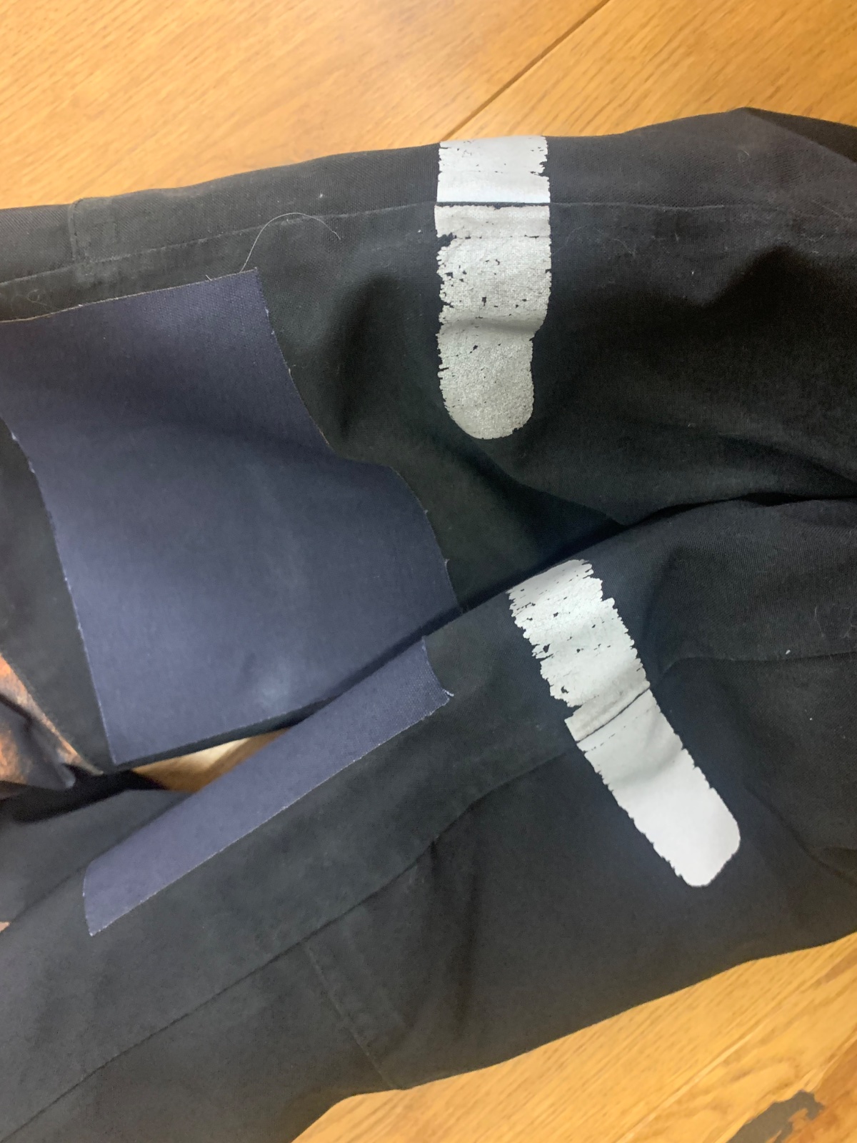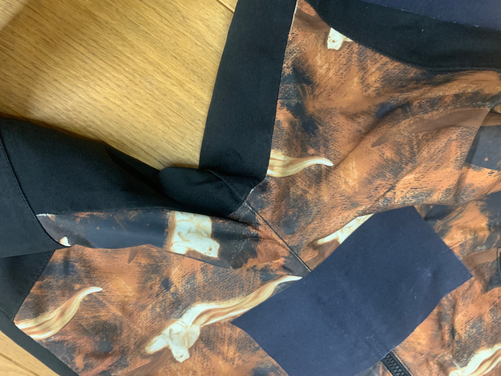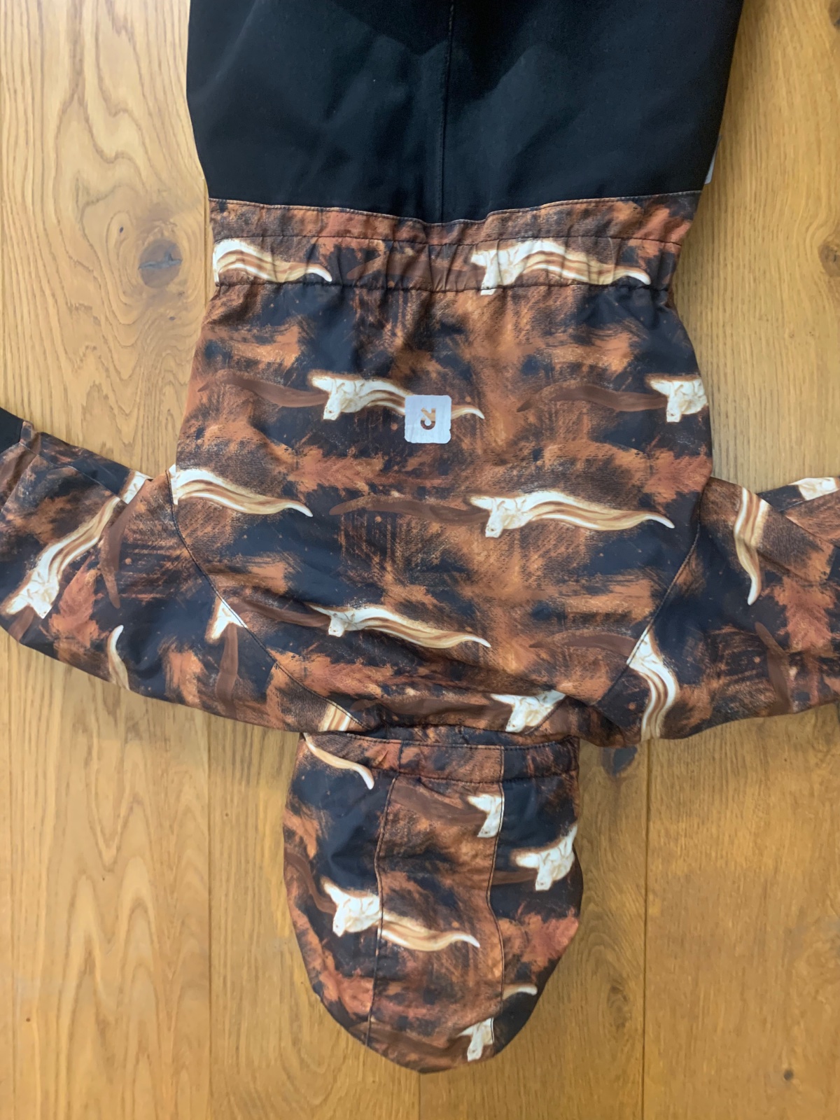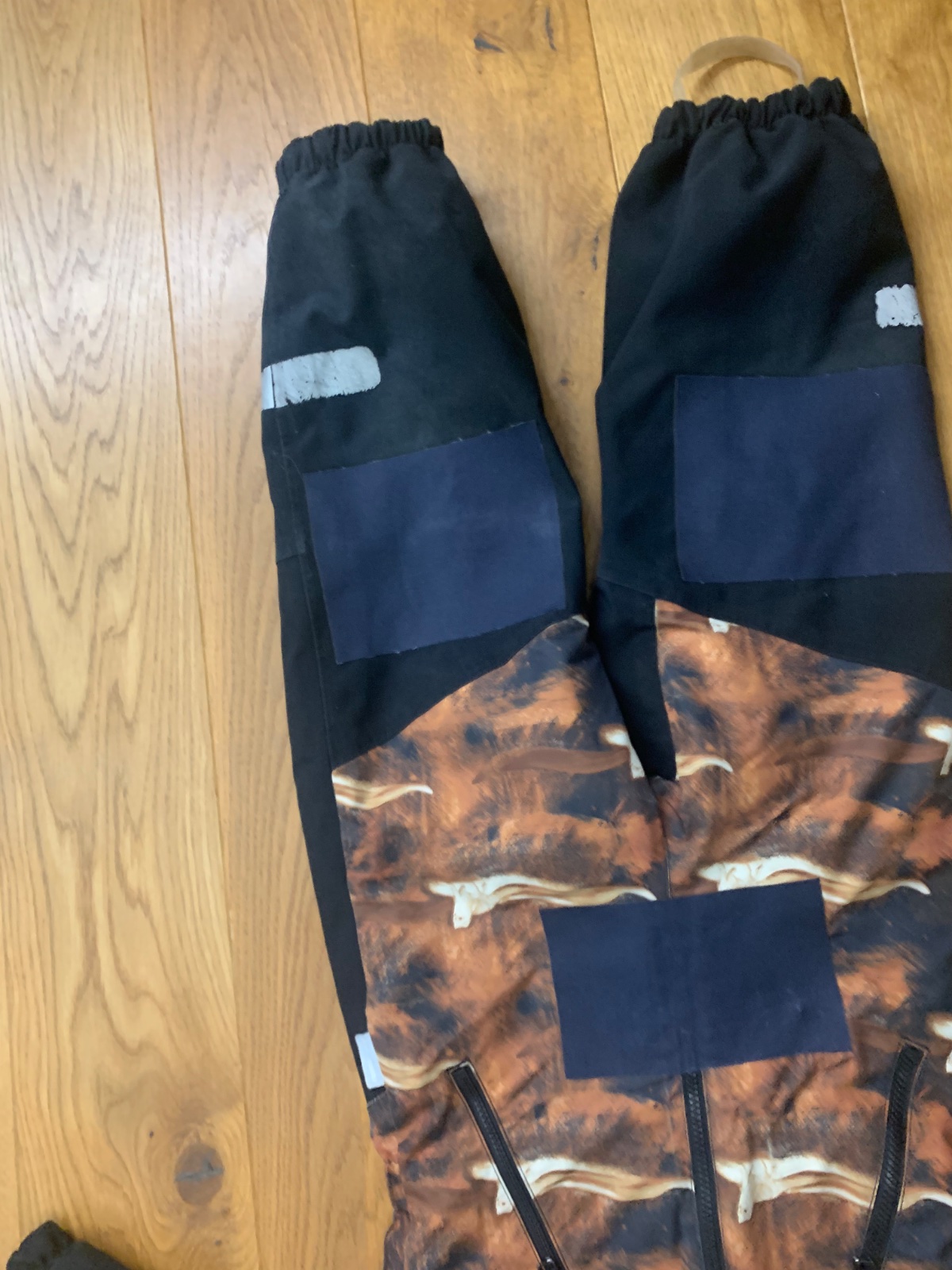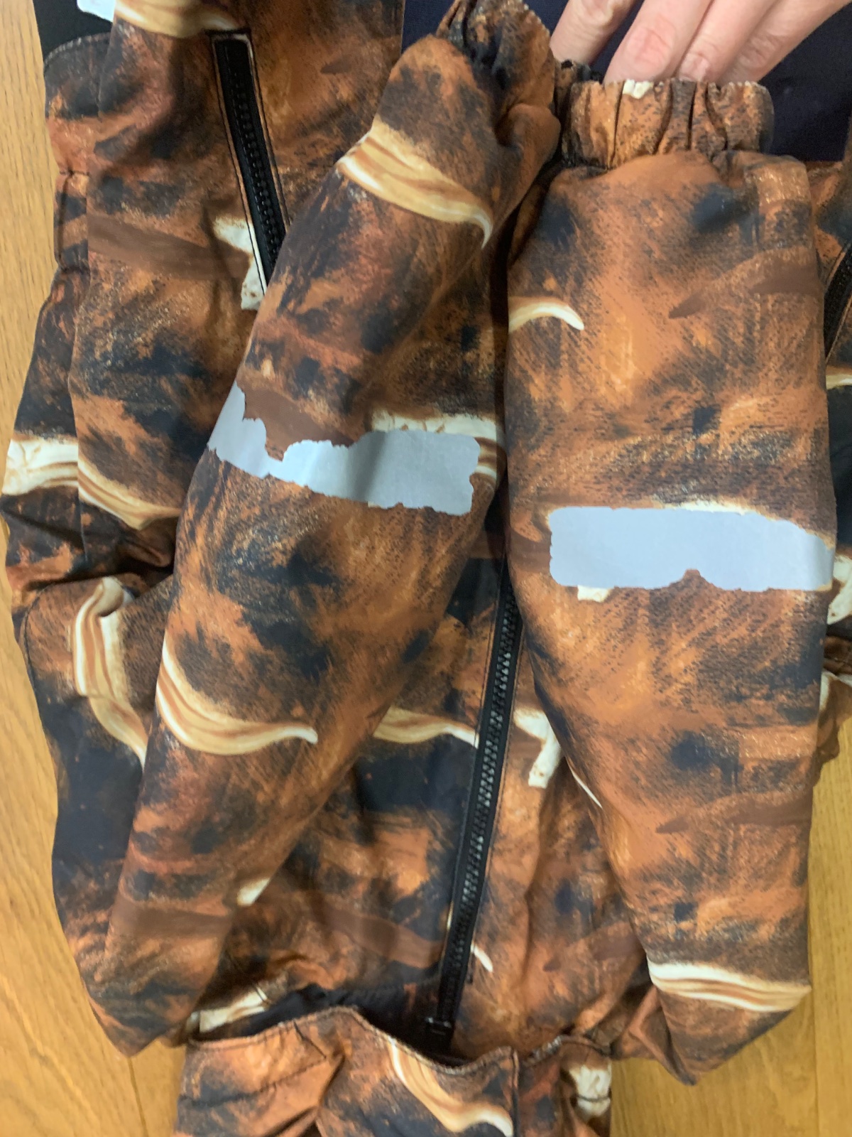 brucho, zips PLNE funkčný, skrátený záplatou o cca 5 cm, pretože syn sa v nej spúštal po ľadovci po bruchu.