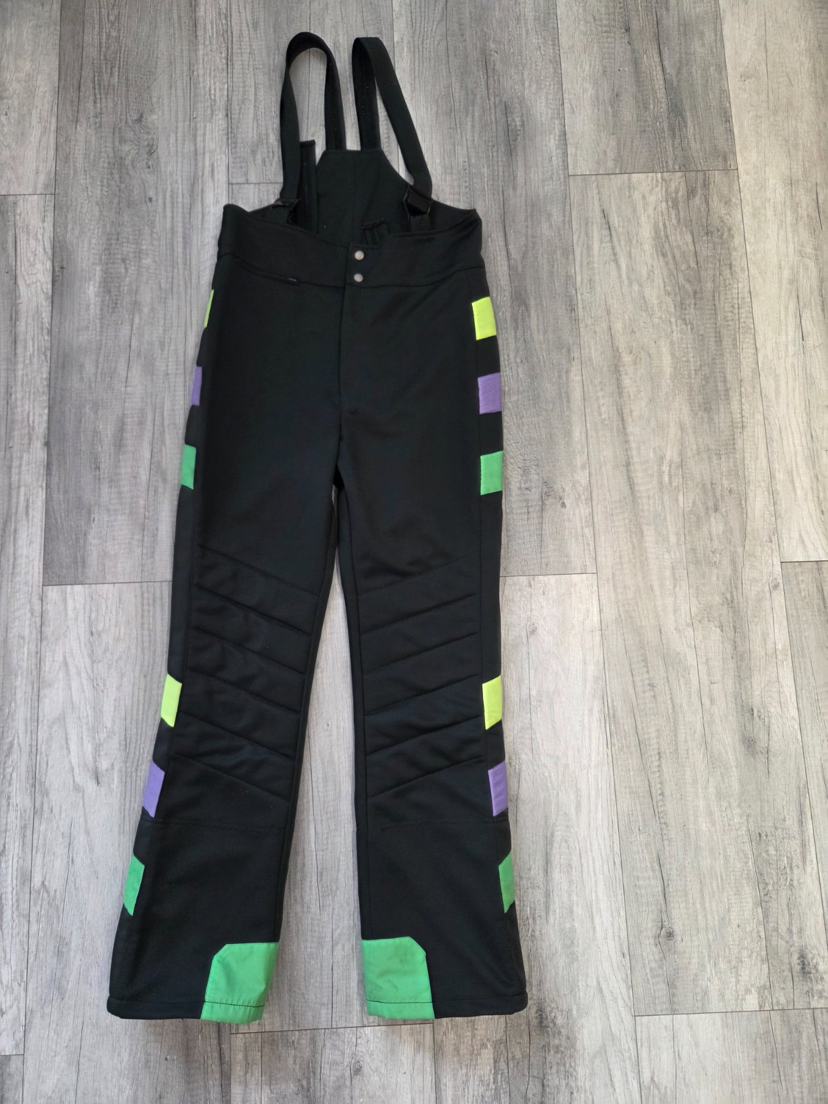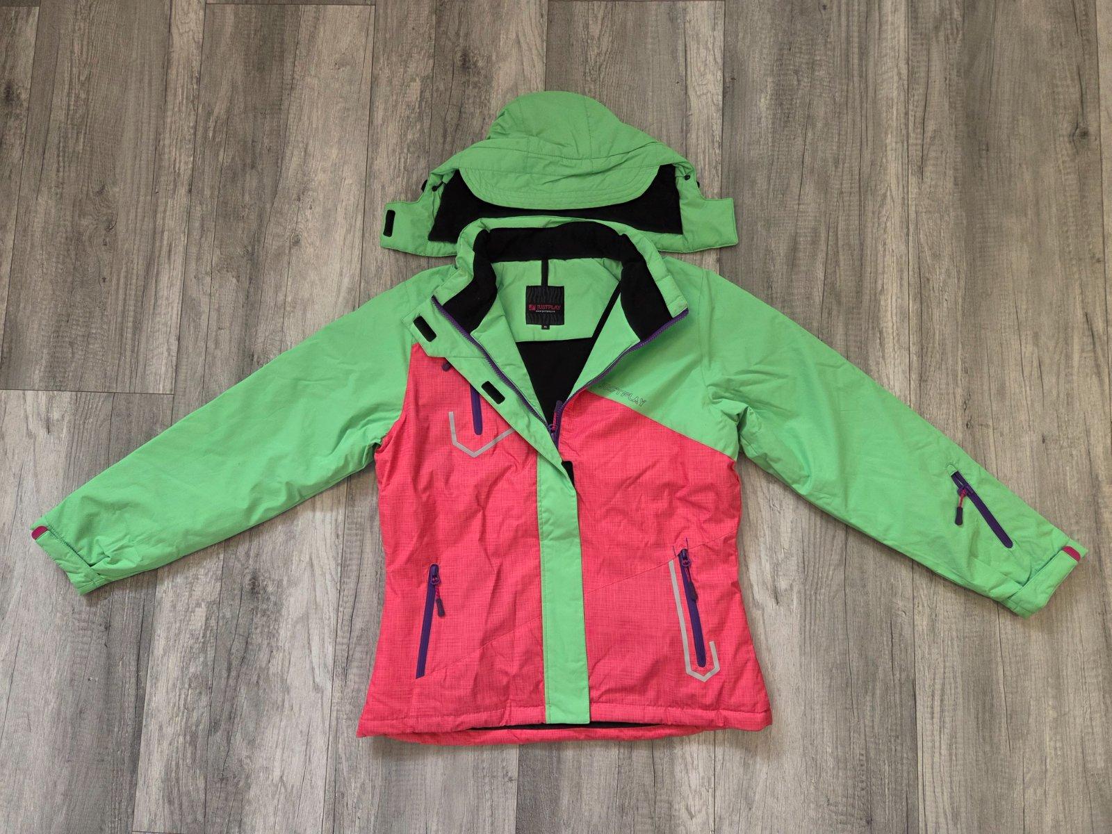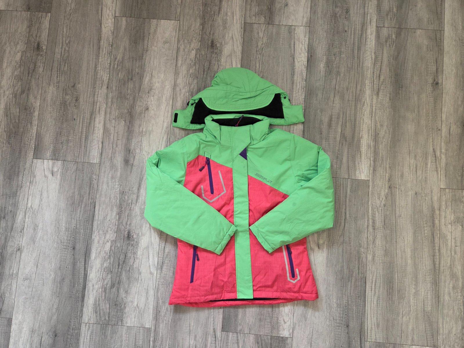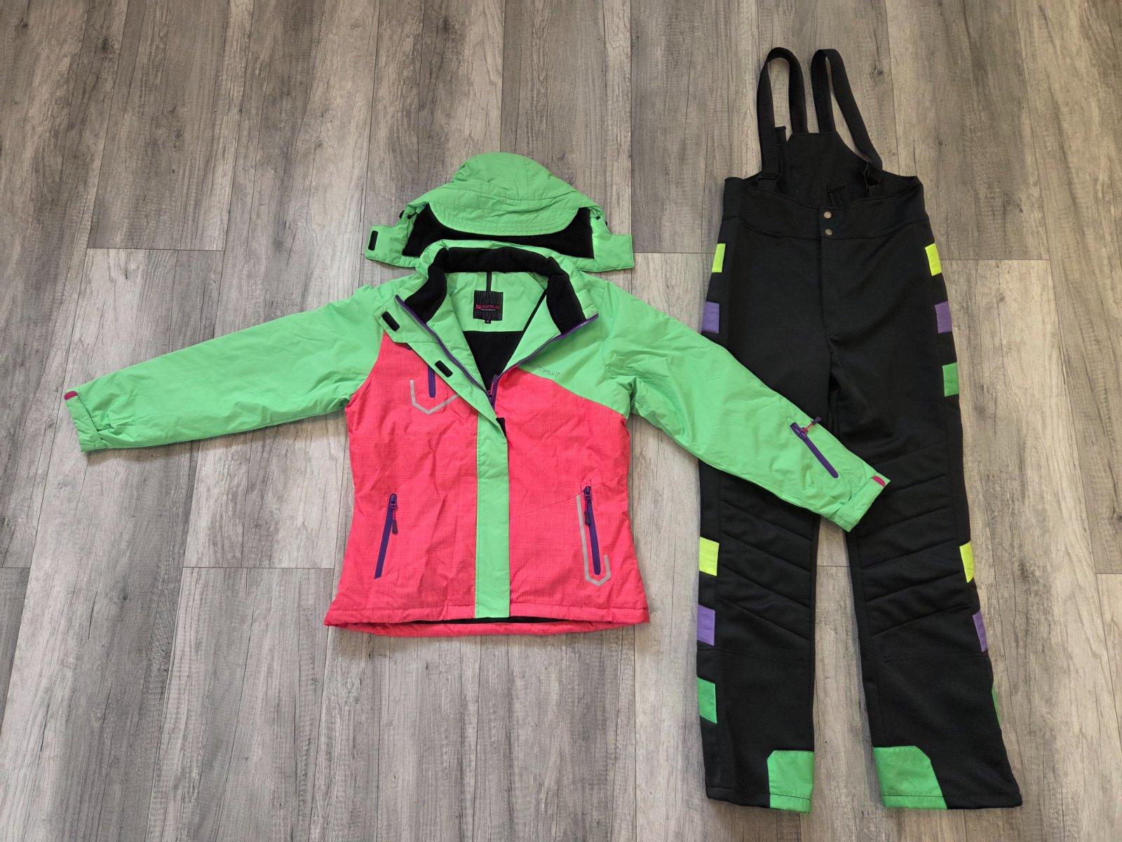 Krásna súprava na zimné športy bunda 1x oblečená, softschelové nohavice perfektný stav. Bunda má snežný pas proti vniknutiu snehu a viacerovo zipsov.
