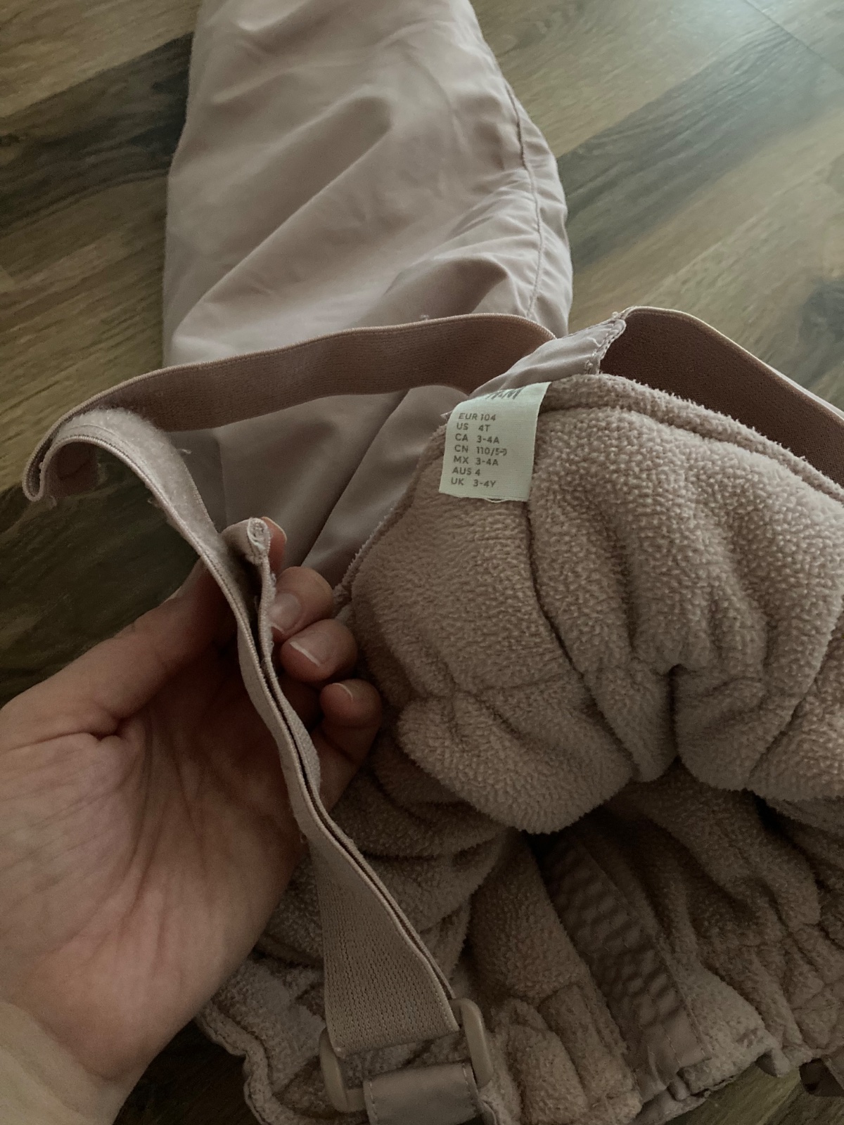 Posuniem pekne oteplovacky zn. H&M vel. 104, podla mna tak aj sedia. Sme druhi majitelia, u nas vzate asi len 2-3x. Za mna skor do mesta ako do snehu, skor stylovka ako oblecenie na sankovacku, pri dlhsom pobyte v snehu premokaju.