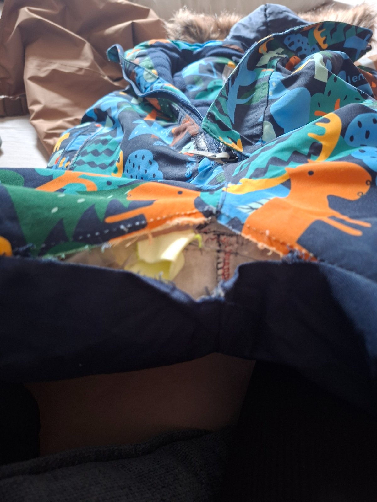 Stále dobrý nosený stav, na zadku zašívaný šev v profi krajčírstve. Bez dier, alebo fľakov. Značná ako 110, sedí na 116 až 122. Miery: celková dĺžka : 98 cm, šírka 35 cm, rukáv od ramenného švu 4...