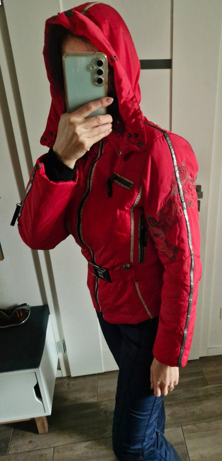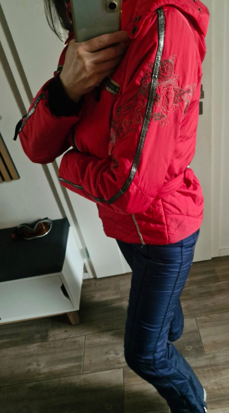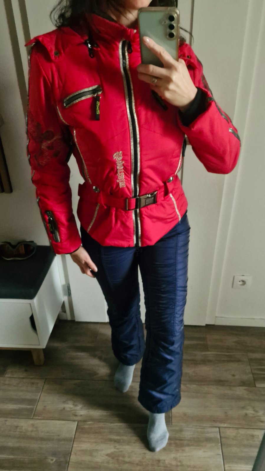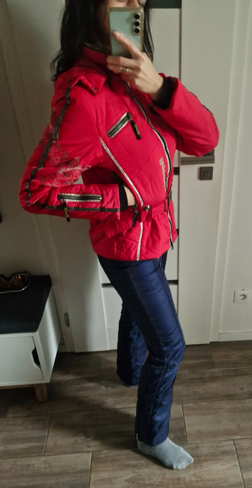 Svieza,velmi stylova super kvalitna lyziarska supravka premiovej zn.SPORTALM pozostavajuca z kvalitnej bundy zn.Sportalm,nadherne farby,uzasne vysite detaily,spona na opasku,krasne tvaruje postavu,velmi zenska,odnimatelna kapucna,vrecko na skipass,so sneznym pasom a nadhernymi detailami,vh,teplucka a pohodlna,v.S,ponosi aj XS,k tomu velmi pohodlne a stylove skvele lyziarske nohavice s vysokym pasom a stylovym opaskom rovnako od tejto renomovanej zn.Sportalm v krasnej tmavomodrej farbe s perletovym leskom,v.S,zodpoveda XS-S,v pase elasticke,vzadu guma,prisposobive,naspodu snezne pasy,moznost pohodlbeho rozopnutia pri obuvani na lyziarku,postranne vrecka,vysoky pas,prijemne hreje aj na krizoch,dokknaly strih,pohodlny+skvelo tcaruje zensku postavu.