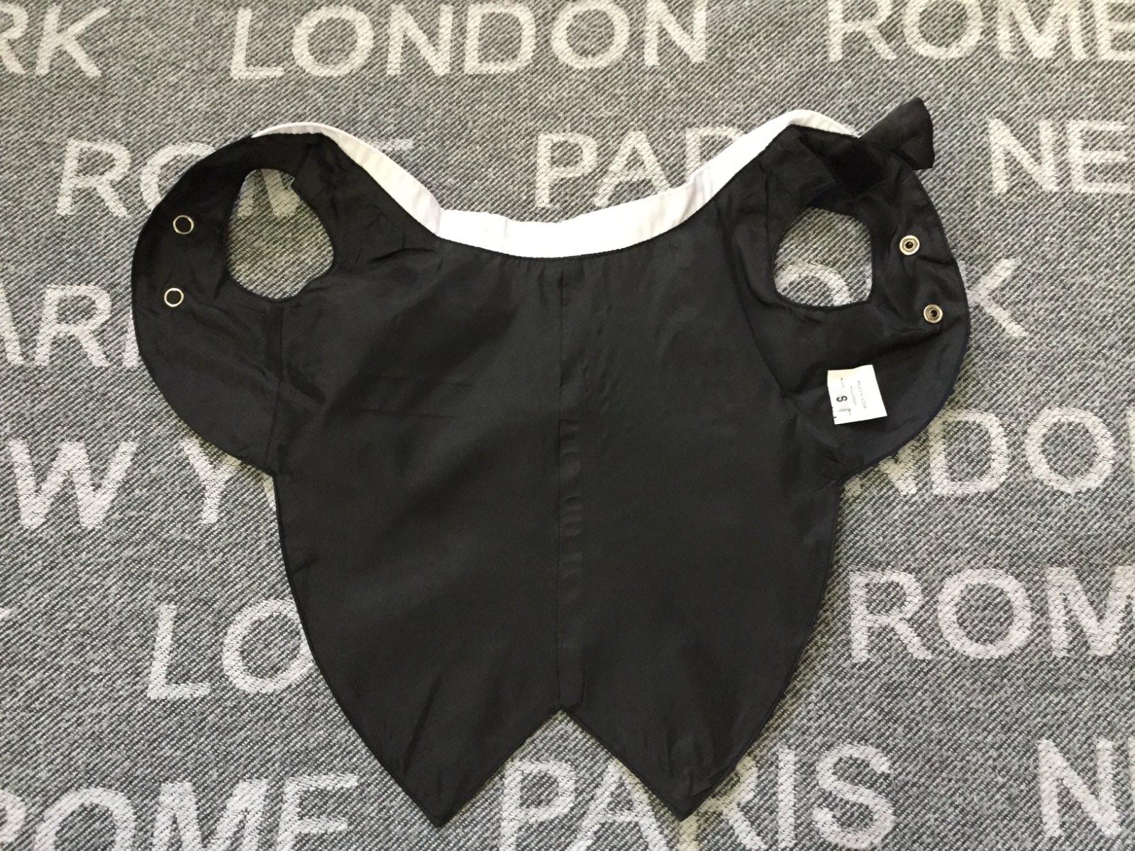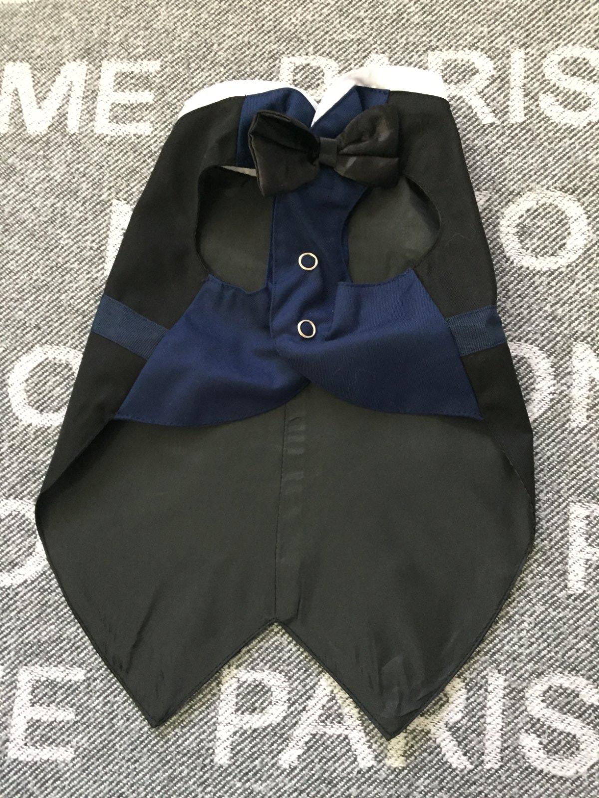 Oblek na svadbu, oslavu, sviatky pre maleho psa, kocura. Farba cierno-modra. Len vypraty. Cela dlzka na chrbate je 31cm, sirka kde sa pripina voditko je 21cm