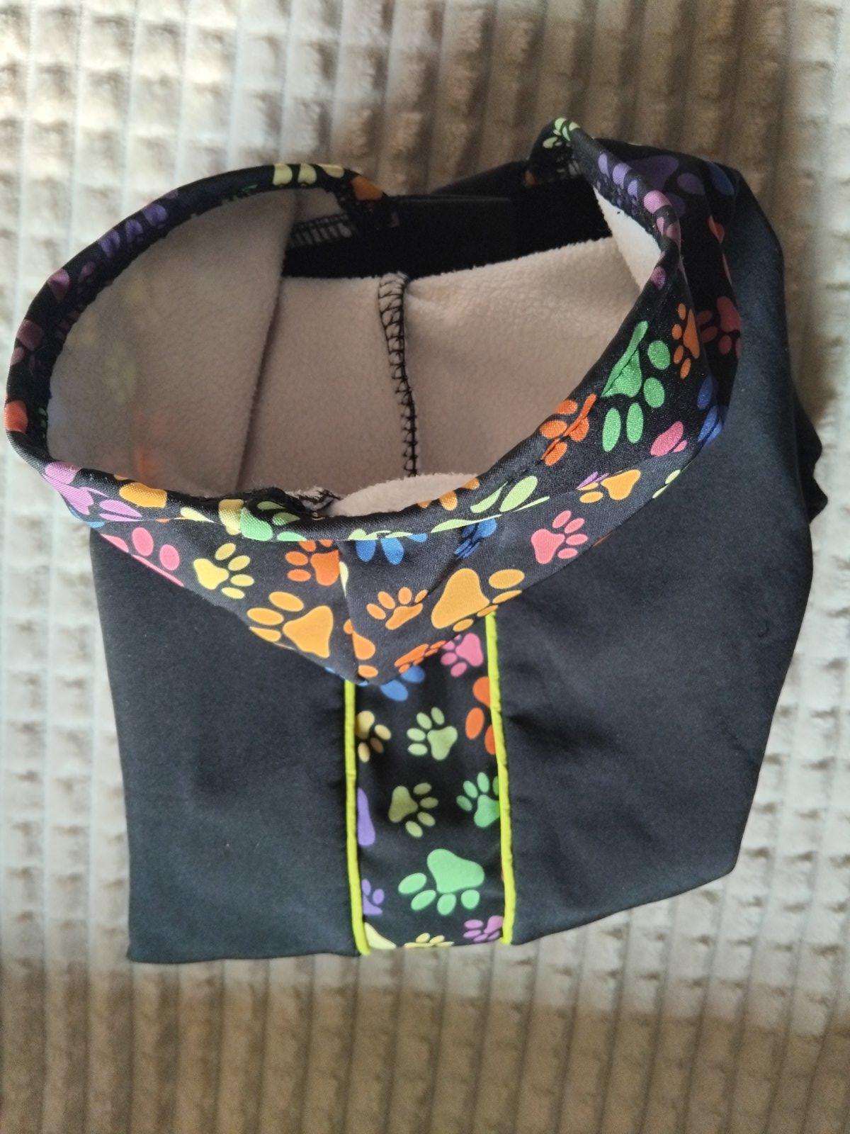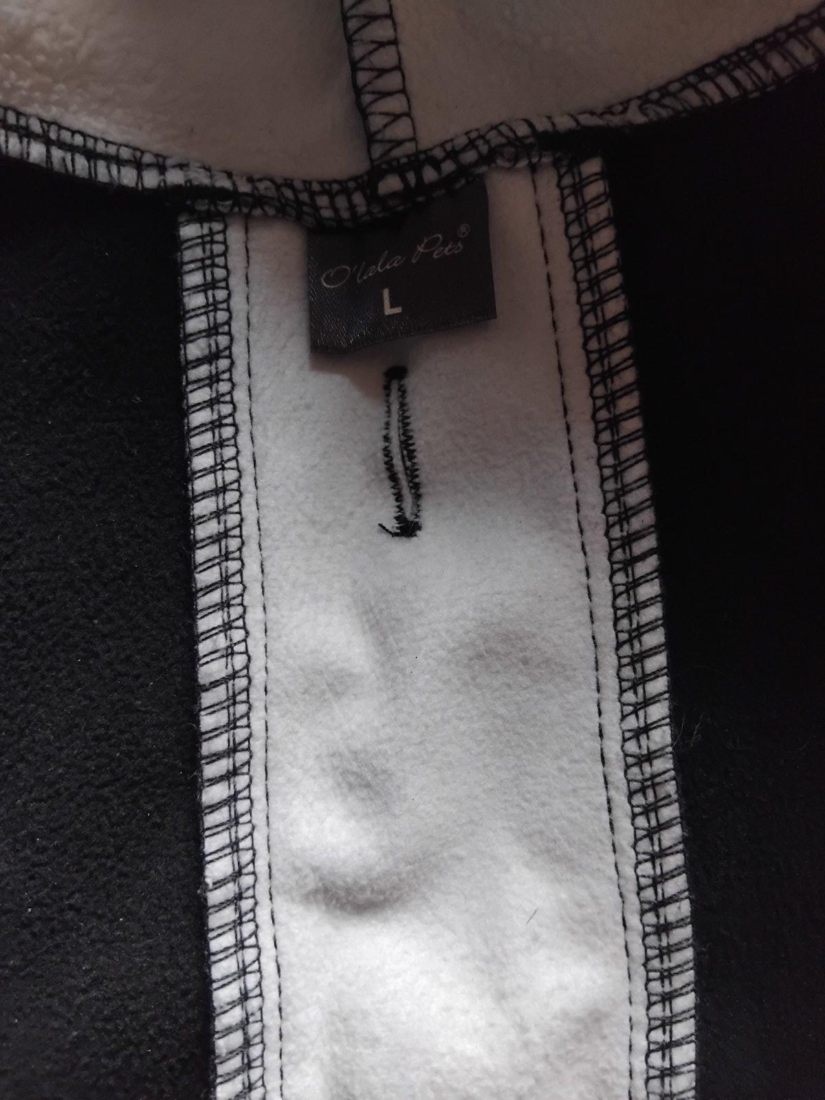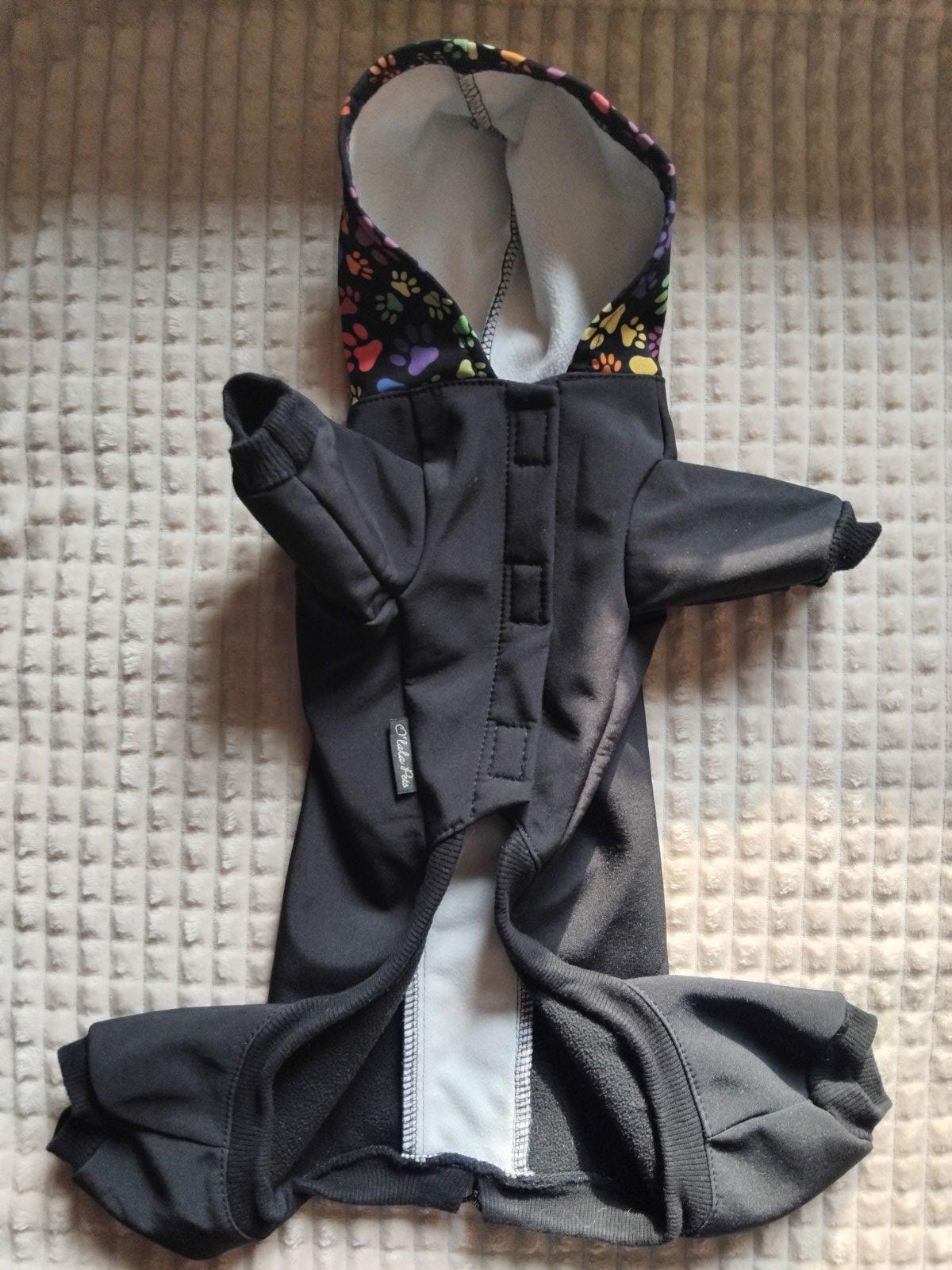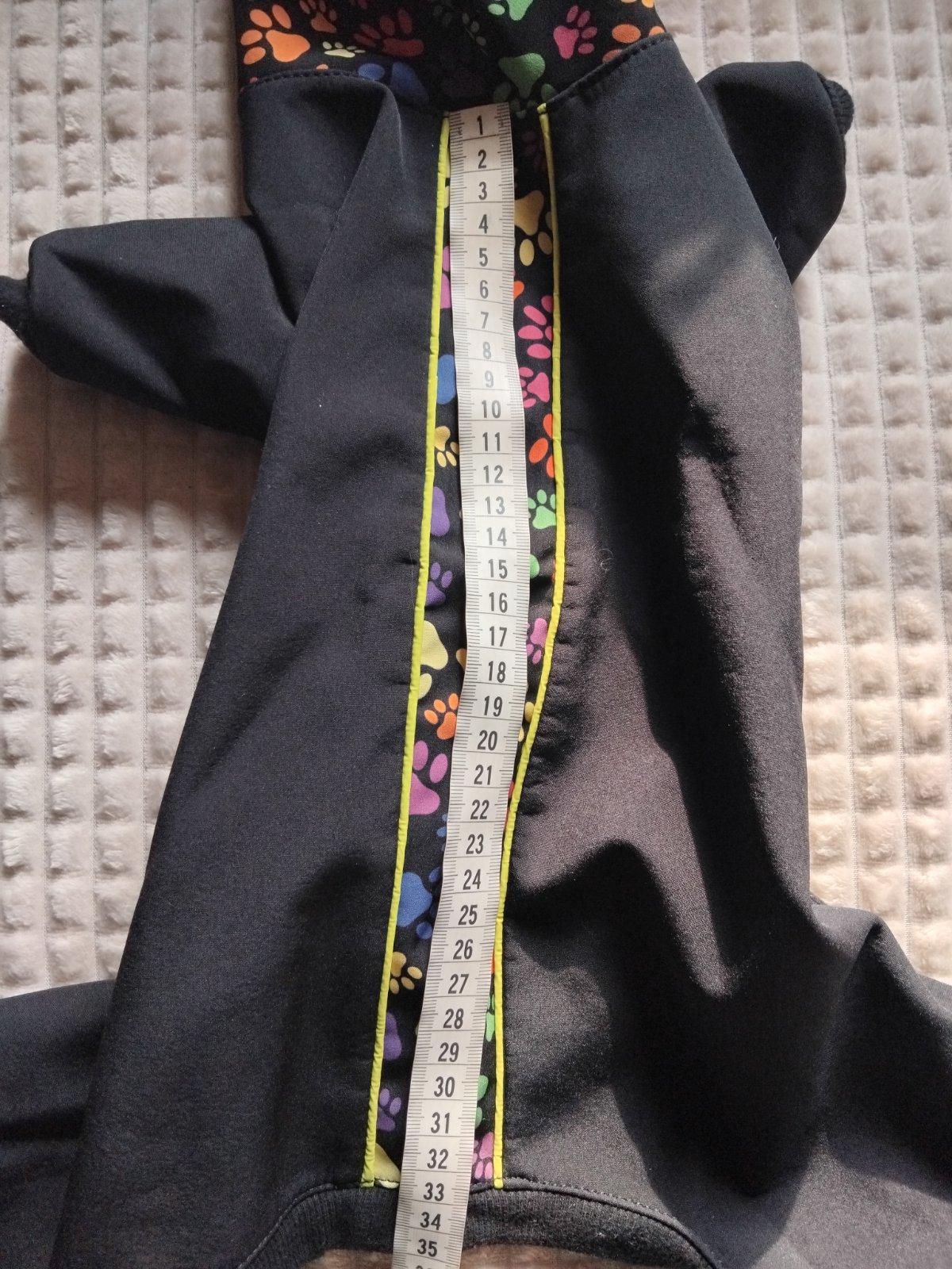 Funkčný overal pre psov s polodlhými rukávmi, celková ochrana proti vlhku, chladu a nečistotám, ľahký a pohodlný s fleecovou podšívkou. Dlzka chrbta 35cm. Pise velkost L, ale je to pre male plemena. Kupovane pre bišona.