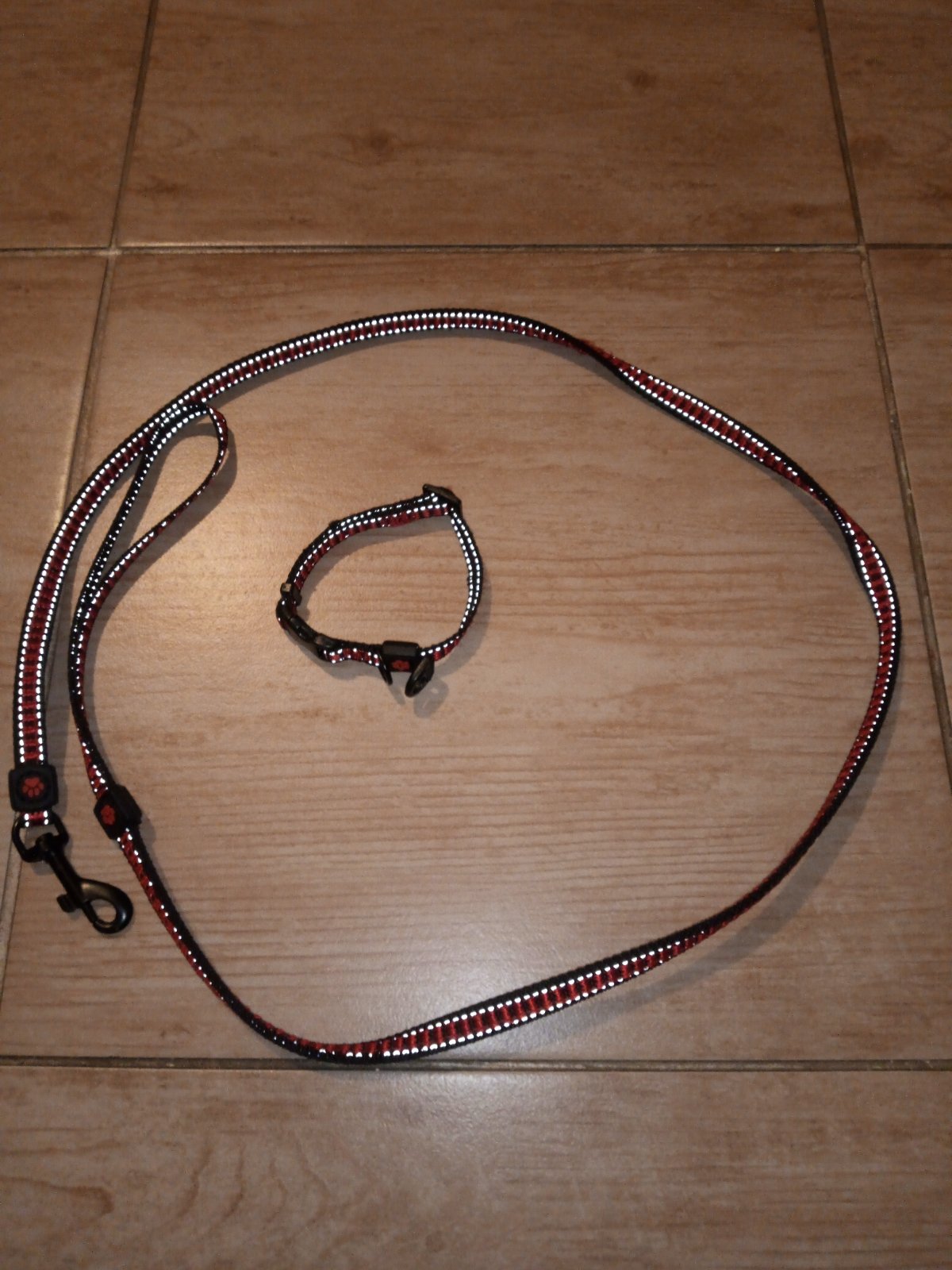 Nové vodítko ,plus obojok pre psíka veľkosť XS,využité asi dva razy,červeno čierna farba