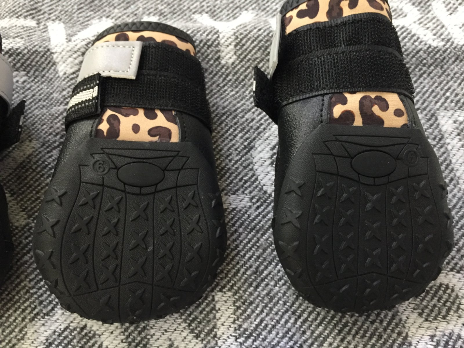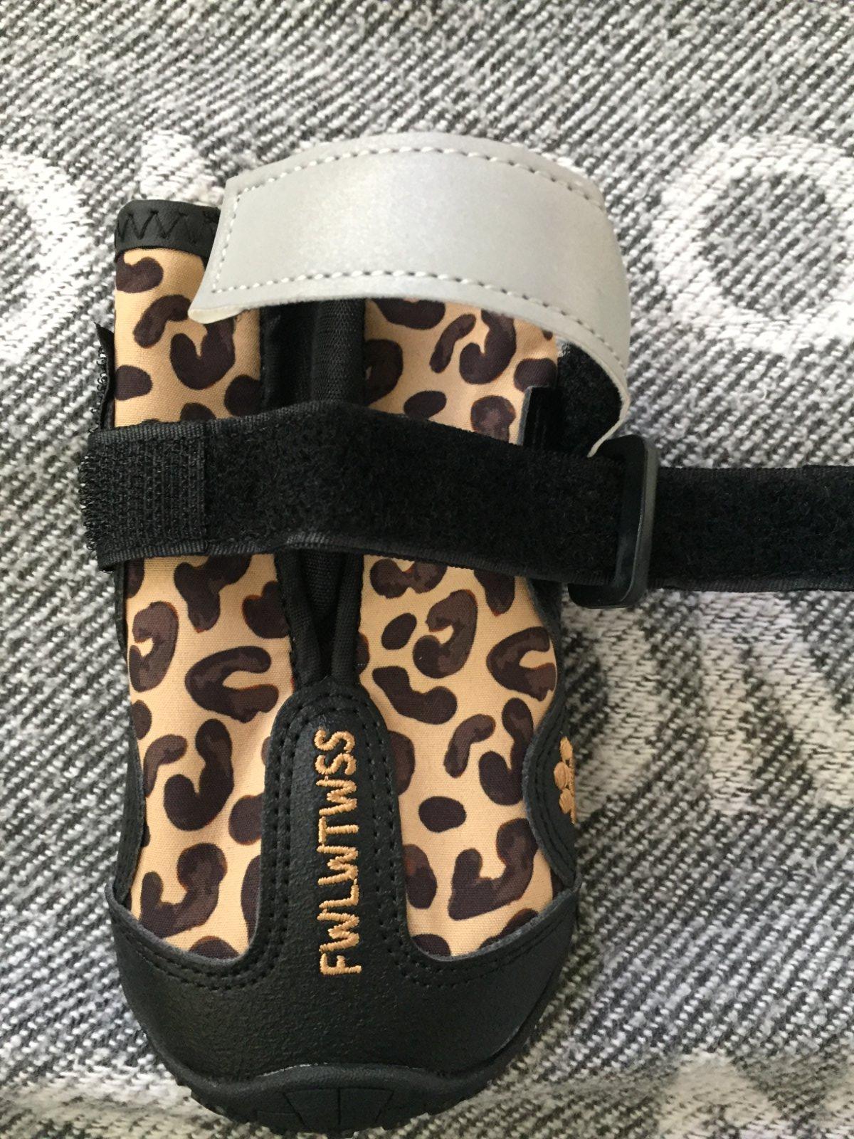 Topanky raz kratko obute, len dnu, stav ako nove. Upinaju sa na labku suchym zipsom. Maju reflexny prvok. Velkost 6, pre stredne velkeho psika. Velkost tlapky na podrazke 6,5x5,5cm, cela dlzka je 14cm, sirka hore 9cm.