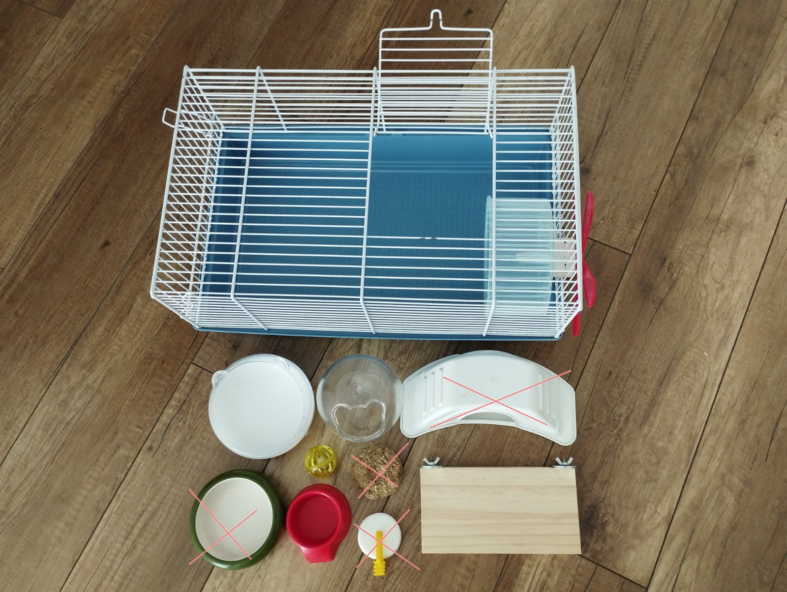 Klietka má bežné známky používania, žiadne poškodenia typu prehryzená mreža či podlaha.