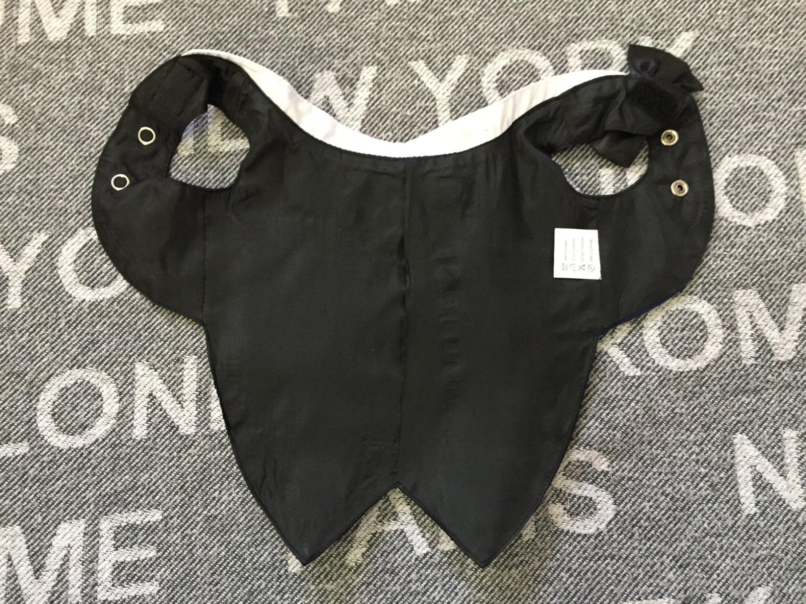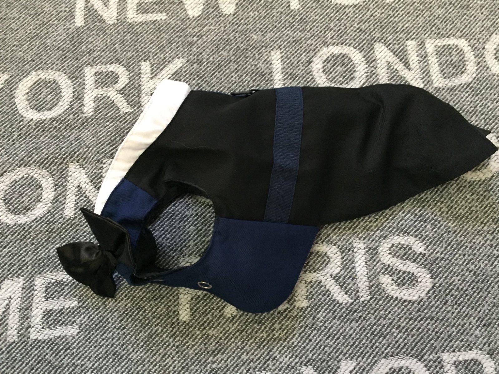 Oblek na svadbu, oslavu, sviatky pre maleho psika, steniatko, kocurika. Farba cierno-modra. Len vypraty. Cela dlzka na chrbate je 26cm, sirka kde sa pripina voditko je 18cm