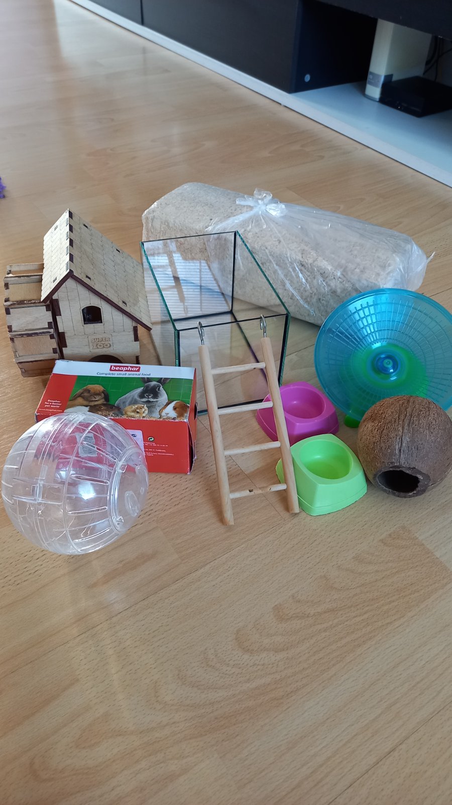 Predám výbavu pre škrečka. Je používaná, zachovalá, v dobrom stave. Výbava obsahuje: maličké slené rerárko na piesok pre škrečka, drevené schodíky, drevený domček s točiacim sa kolom na boku, plastový kolotoč ( náš škrečok ho mal veľmi rád ), skoro celý balík podstielky, 2ks plastových mištičiek na jedlo, papierová prepravka, plastová guľa , aby sa škrečok mohol pohybovať po byte a neutiekol, kokosový orech ( ako alternatívny domček, tiež ho mal rád ). Cena za všetko je 13 eur + pošta, ale najlepší je osobný odber.