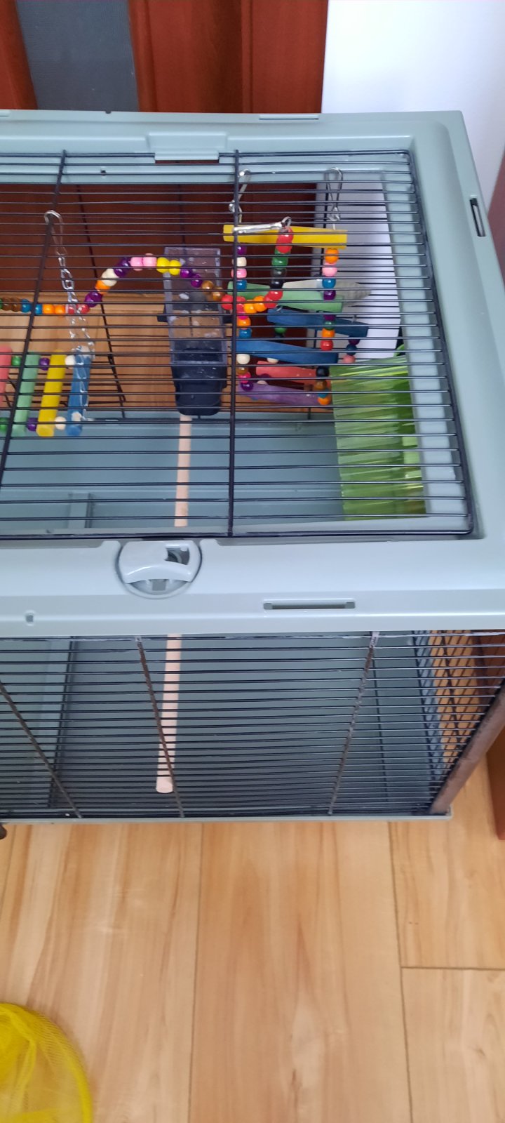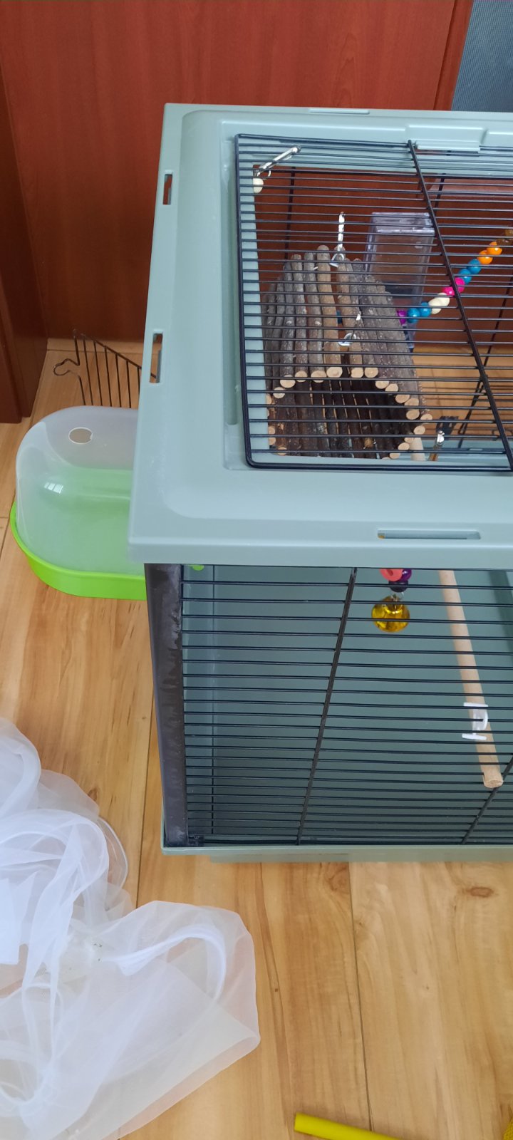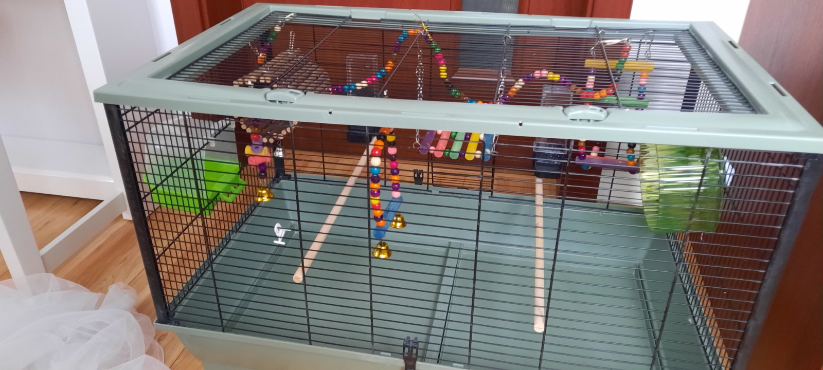 Klietka s prislusenstvom- hojdacky, rebriky, zvonceky, bazen, napajadla, kolotoc. PC 95. Klietka sa da rozlozit, bazen ma odnimatelny spodok aj vrch, podla potreby.