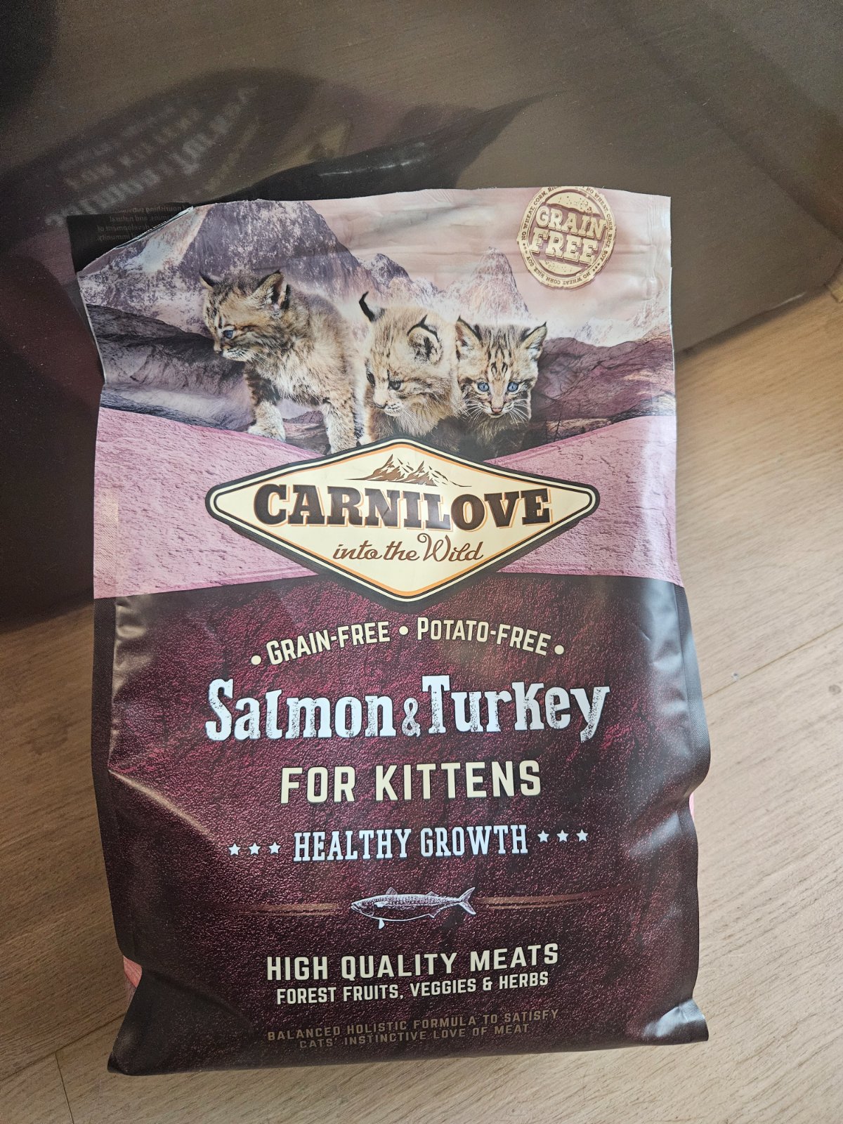 Granule CARNILOVE, losos morka, ktoré zostali, vrecko je na zips, čiže sú zatvorené, chýba asi do 400gr. cca je tam okolo 1,6 kg.