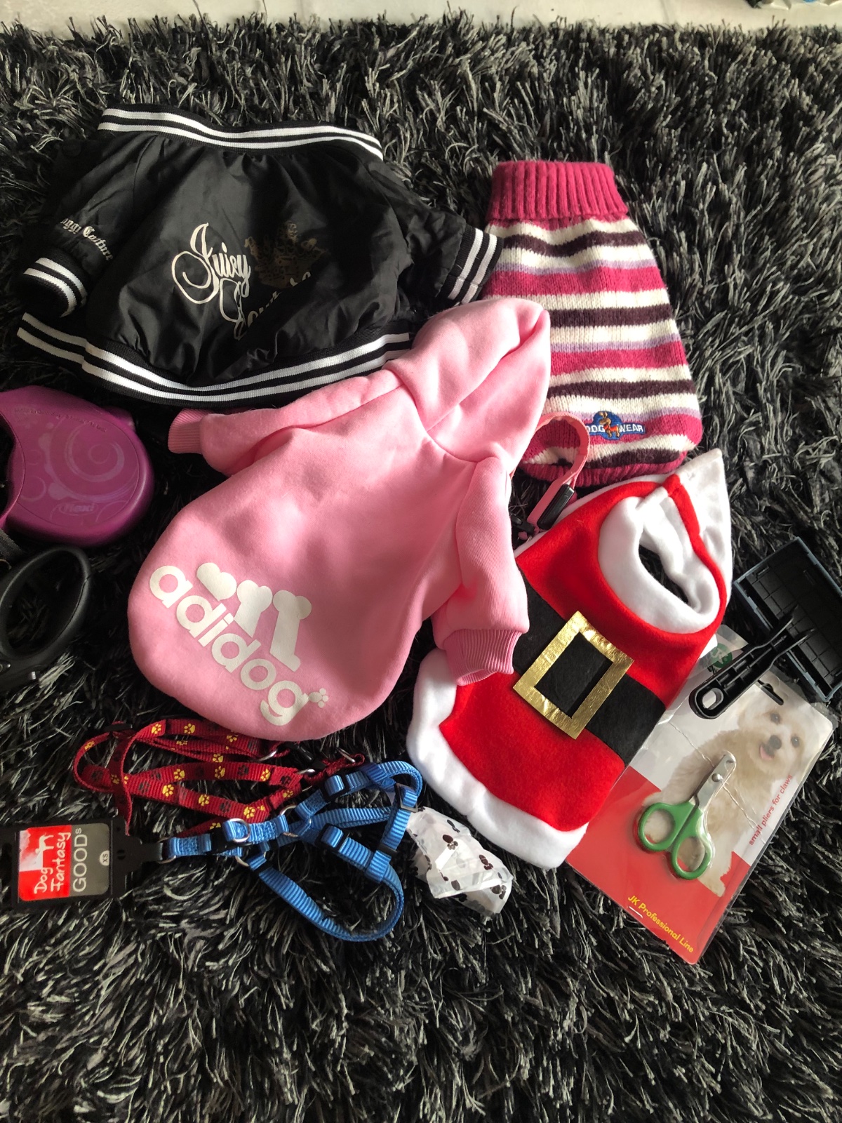 Bomberka Juicy Couture, mikinka Adidog, svetrik, vianočný oblečok, dvakrát vodítko, dvakrát postroj, klieštiky na strihanie patúrikov, kefka na česanie. Vhodné pre malého psíka okolo 2 kg.