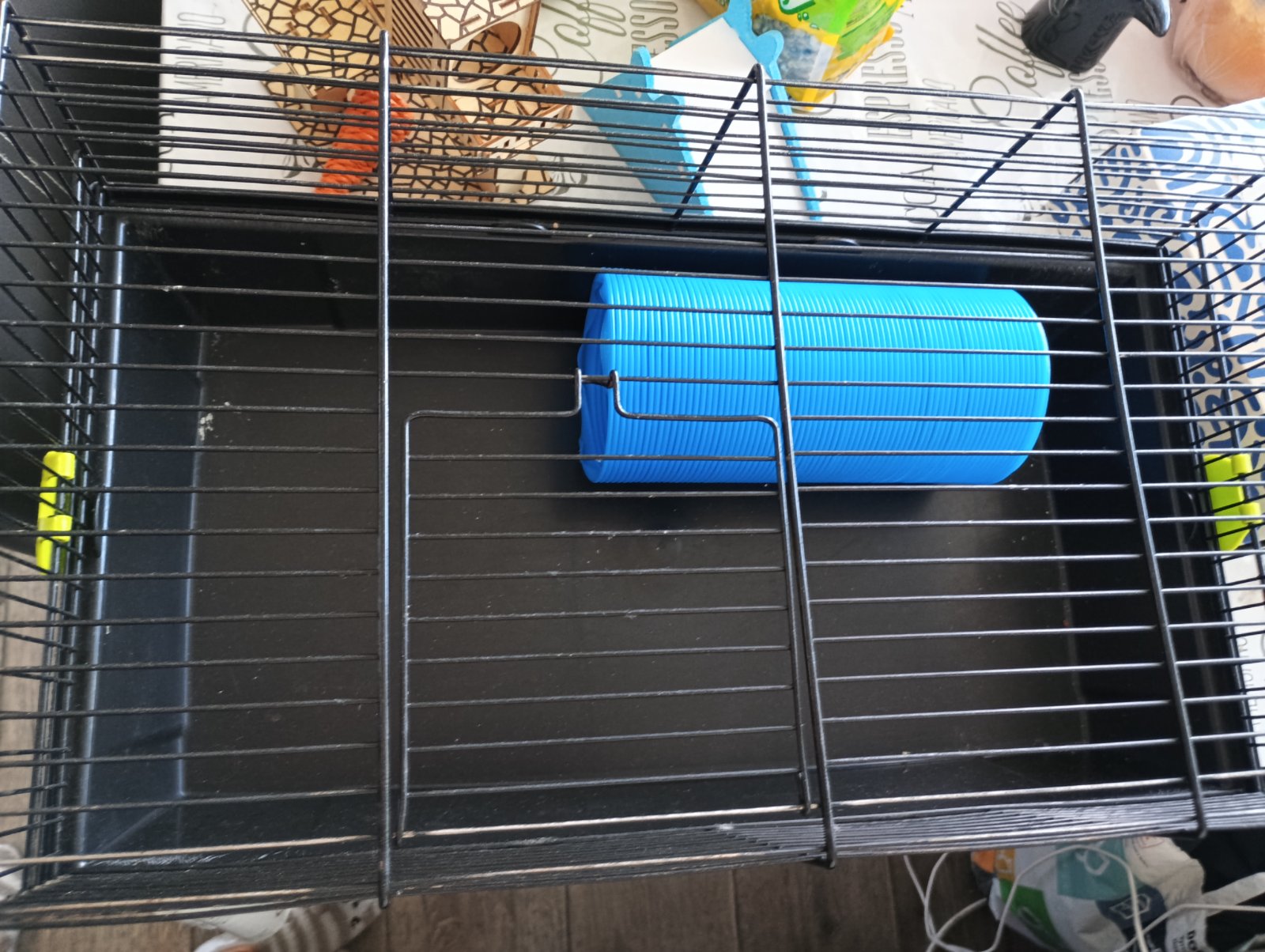 Klietka ma rozmery : Hĺbka 55 Výška 150 Dĺžka 100 Má umývateľnú spodnú časť , otvarave dvierka z oboch strán pre ľahšiu výmenu piesku z nádoby , modrej kupelničky v ktorej sa radi kúpu . A z druh...