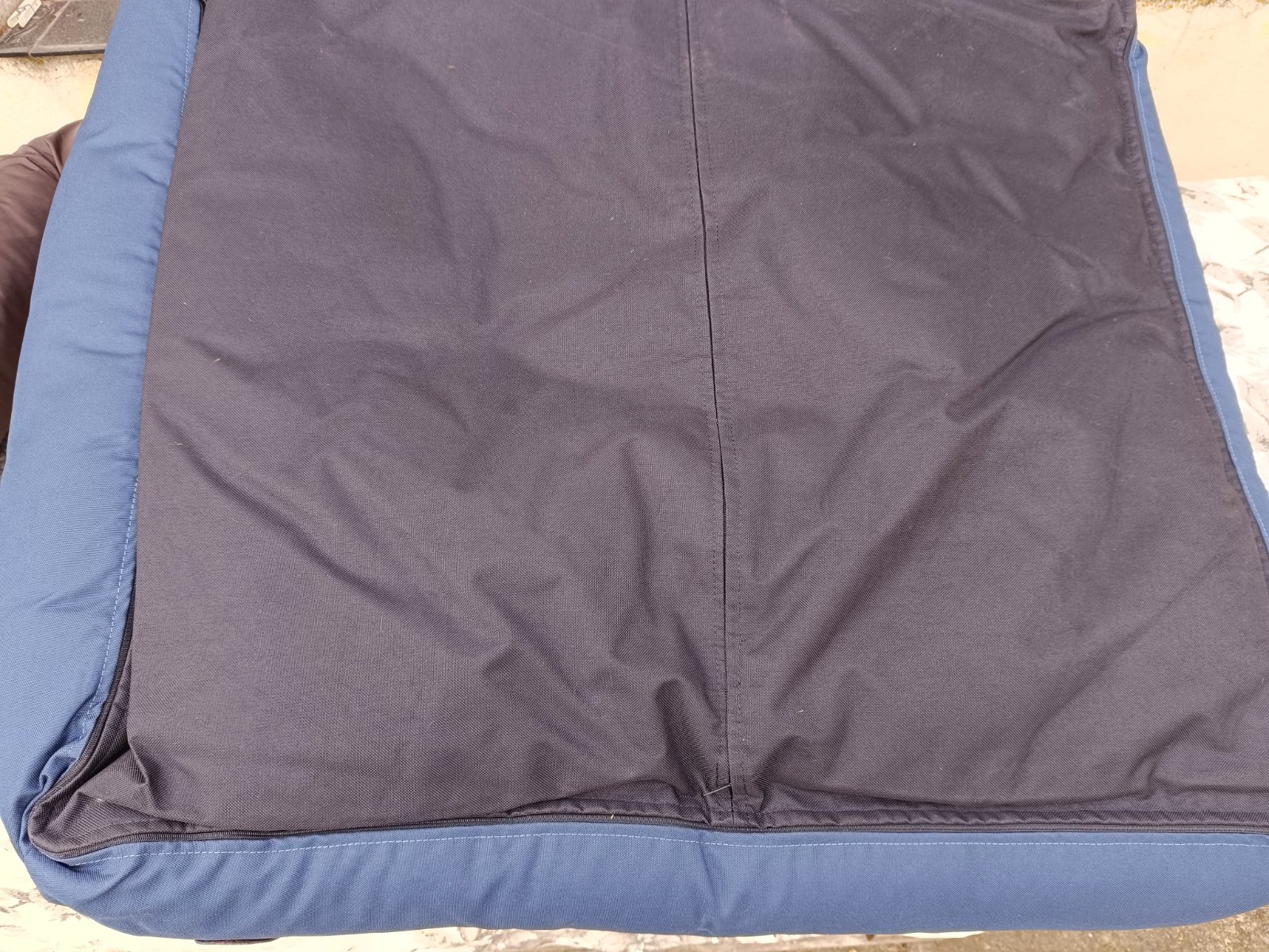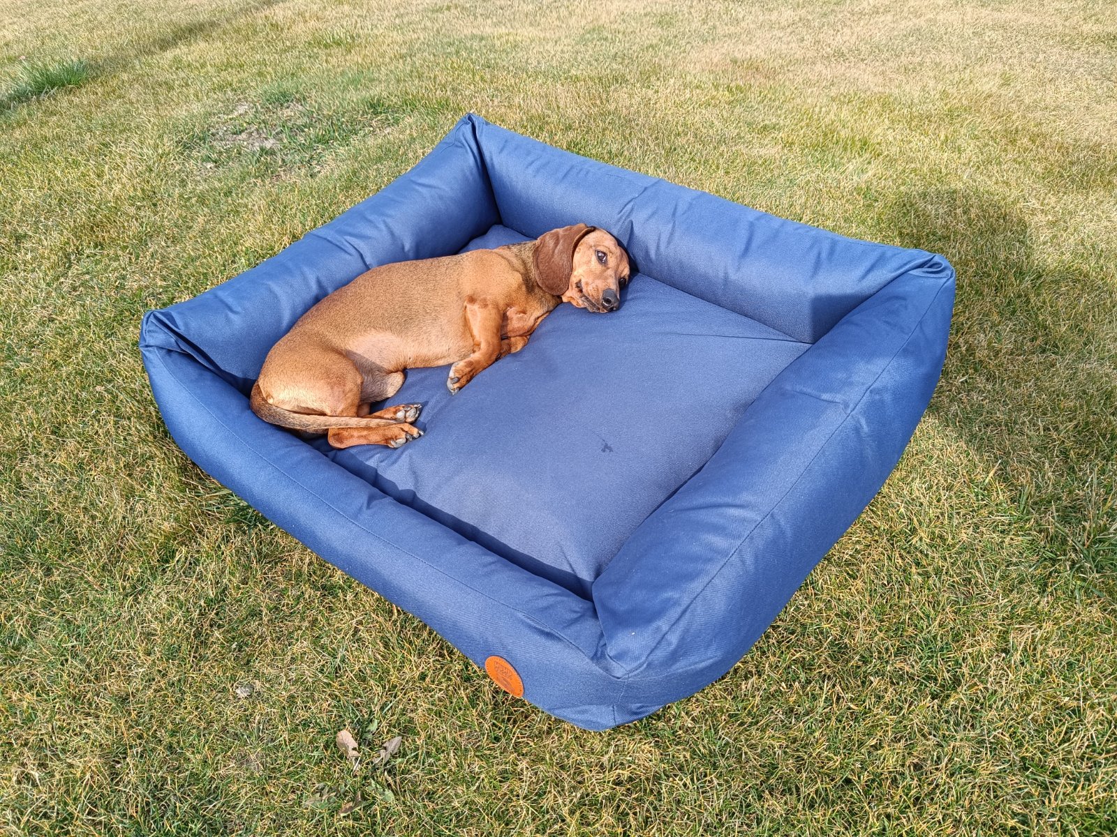 Nepremokavý pelech, modrý, rozmery spodná strana dĺžka 80 cm, šírka 70 cm, výška krajov 20 cm. Už nevyužijeme. Pes nie je súčasťou