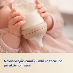 Umožňuje plynulé a nerušené sanie bez príjmu vzduchu. Cumlík je nekvapkajúci – mlieko tečie iba pri aktívnom saní.