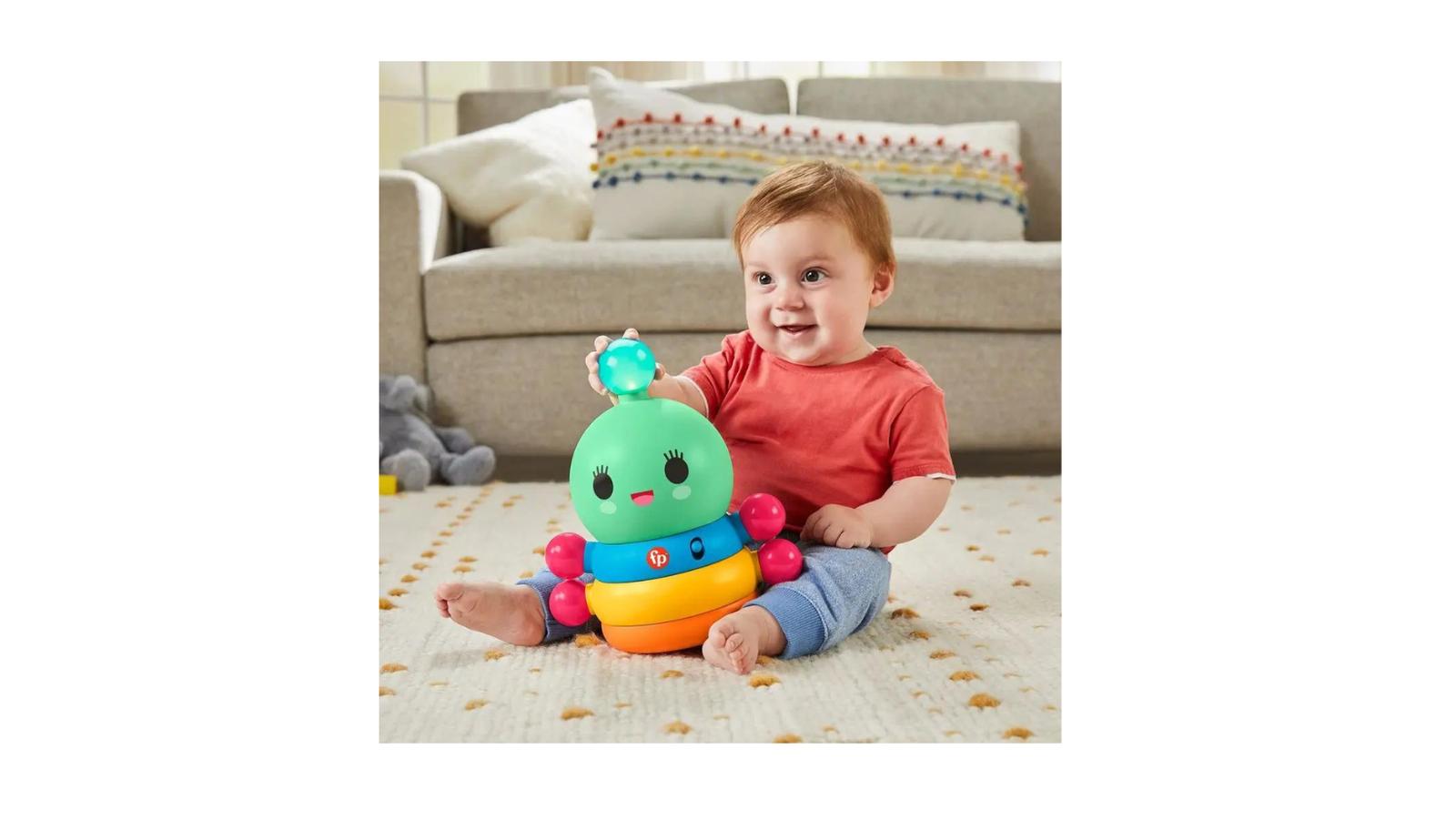 S Happy World Tancujúcou dážďovkou™ od Fisher-Price® sa hrá hravo! Keď si dieťa sadne a hopsá s touto tancujúcou dážďovkou, rozsvieti sa jej tykadlo a vydáva zvuky, čím sa vaše dieťatko zoznámi s javom príčiny a následku.