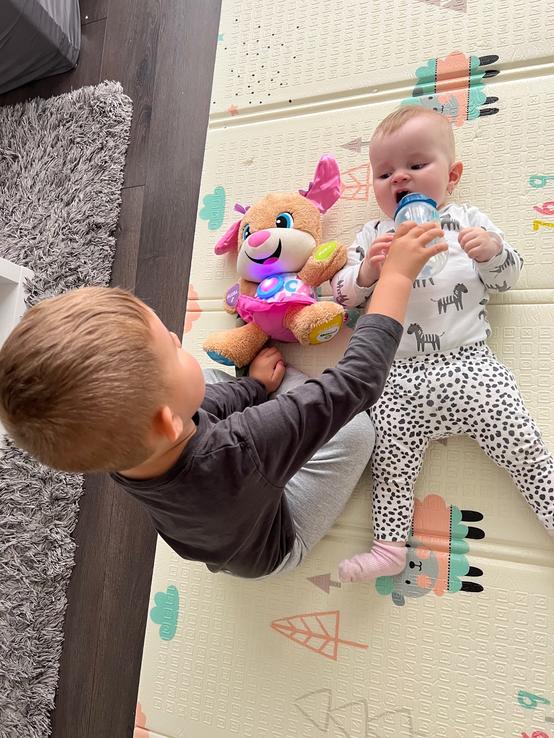 Starší chlapci mali hovoriaceho psíka a určite nesmie chýbať ani našej malej princeznej... Tak jej Ježiško doniesol hovoriacu sestričku 😍...velmi príjemný materiál v krásnych pestrých farbách. Zvuky a pesničky nás vždy roztancujú... Veľmi vydarená hračka