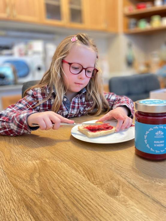Moje deti veľmi obľubujú sladké raňajky. Najčastejšie si dávajú vianočku, čerstvý chrumkavý chlieb alebo hrianku s maslom, medom, či džemom. Maliny v mede sú chutnou alternatívou a mali u nás veľký úspech. Medík je hutnejší, ale roztiera sa ľahko. Maliny v kombinácii s medom vytvárajú lahodnú, osviežujúcu chuť.