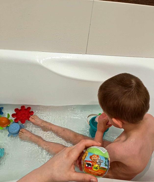 Tak táto loptička (ako ju nazval syn) bola najlepšia vec z balíka. Syn mal takú veľkú prvý krát. Pomaličky sa rozpúšťala a menila farbu vody. Má príjemnú nevtieravú vôňu. Syn sa tešil z celého procesu kúpeľa, farby vody a aj prekvapenia vo vnútri. ☺️