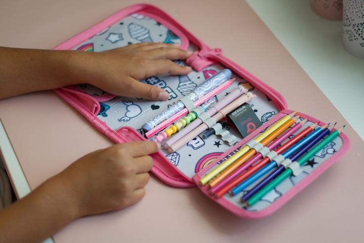 Už po prvom otvorení som si všimla, že je tam miesto na všetko. Sú tam úchyty na pastelky a fixky, tri širšie na pravítko, kružidlo či nožnice a dva na gumu či strúhadlo. Pod fóliou na vrchu je priestor na rozvrh. Zipsy sú pevné, s veľkými „ťaháčikmi“, ktoré zvládne aj malá, spočiatku neistá ruka prváka. Odolajú však aj chvatnému zatváraniu starších “ročníkov”. Veľmi sa mi páči nápad, spraviť podšívku, ktorú si môže dieťa vyfarbiť. Je to kreatívne, nápadité a určite to poteší každé dieťa. Páči sa mi, že je v rovnakom dizajne ako školská taška. Všetko krásne spolu ladí.