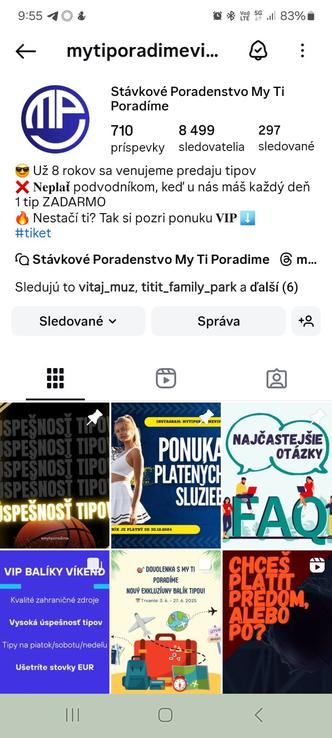chcem Vás upozorniť na podvodnú stránku Stávkové poradenstvo My Ti Poradime. Kúpil som u nich členstvo VIP premium, kde mi garantovali zisk a v prípade nespokojnosti vrátenie peňazí za členstvo. Prezentujú úspešnosť cez 70%, avšak realita je úplne iná, úspešnosť majú ani nie 20% a z 31 tiketov vyšlo iba 6. Keď som poukázal, že nezverejňujú reálne výsledky a zverejňujú iba pozitíva, tak ma zablokovali a ešte si vymysleli, že ich tipy posúvam ďalej a chceli odo mňa náhradu škody 600 Eur :) Dávajte si pozor a zvážte kúpu ich služieb a spoluprácu s nimi ! Aj mi písali, že mi vrátia peniaze do 10 dní, no zase to bolo iba klamstvo ! Všetko mám zdokladované a v prípade záujmu pošlem. Ak Vás táto správa nezaujíma, tak sa ospravedlňujem za spam, len som potreboval na nich upozorniť ďaľších ľudí, ktorí zvážujú kúpu ich služieb :) Ak máte nejakú skúsenosť s nimi alebo nejaké info, tak mi kľudne napíšte. Ďakujem.
