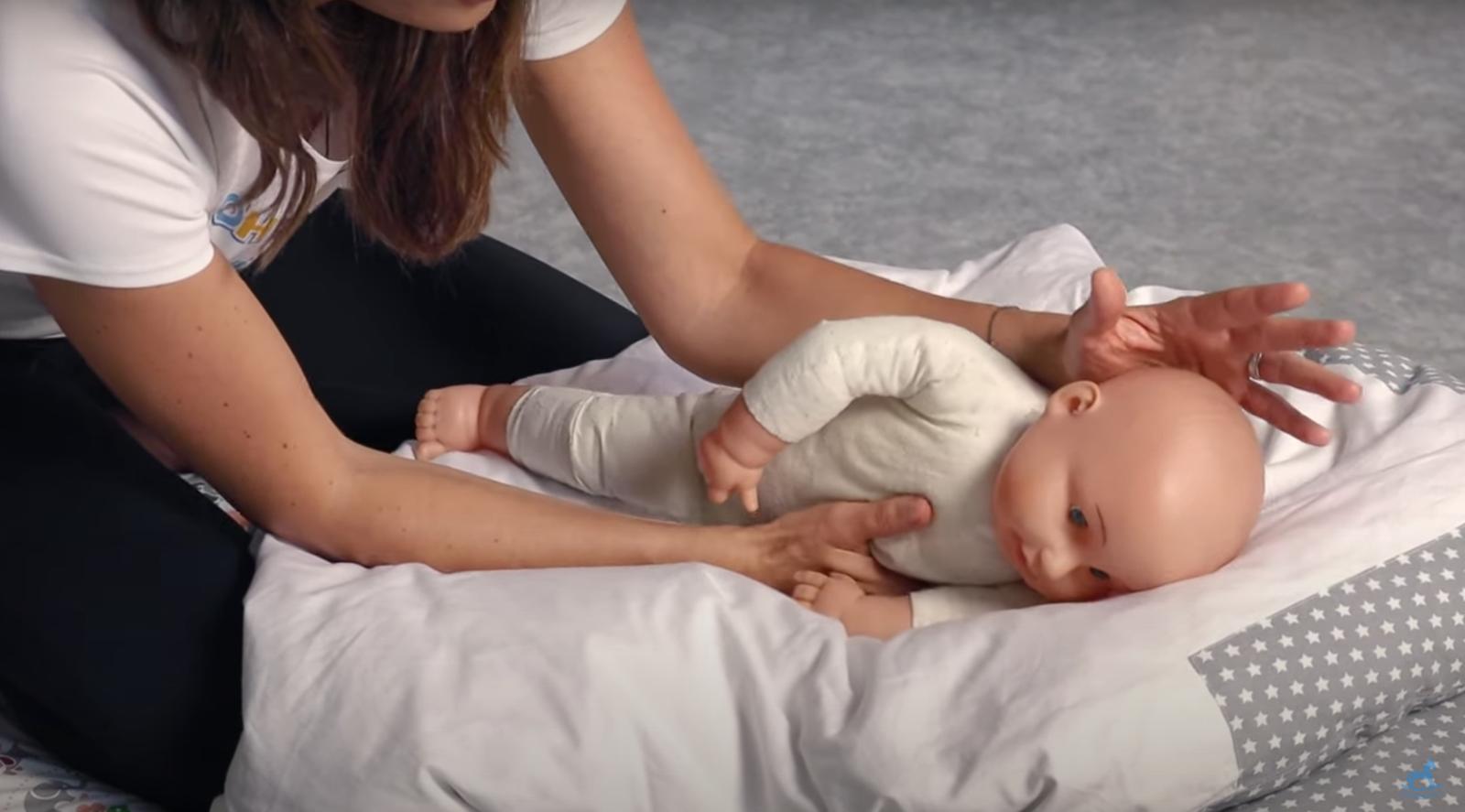 Dieťa pokladáme na podložku cez kolienka, prevalením cez bok. Druhou rukou kontrolujeme hlavičku. Nakoniec zrovnáme telíčko do jednej osi.