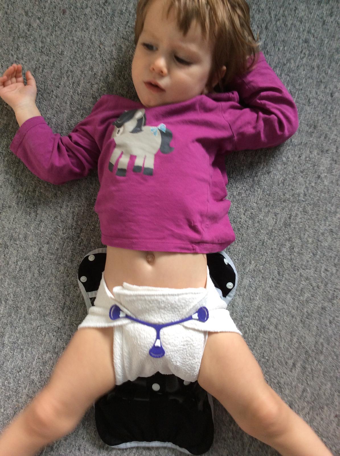 4. Na vrchné nohavičky položíme pripravený nohavičkový sklad, na tento sklad potom separačnú plienku a pripravíme si snappi sponku.