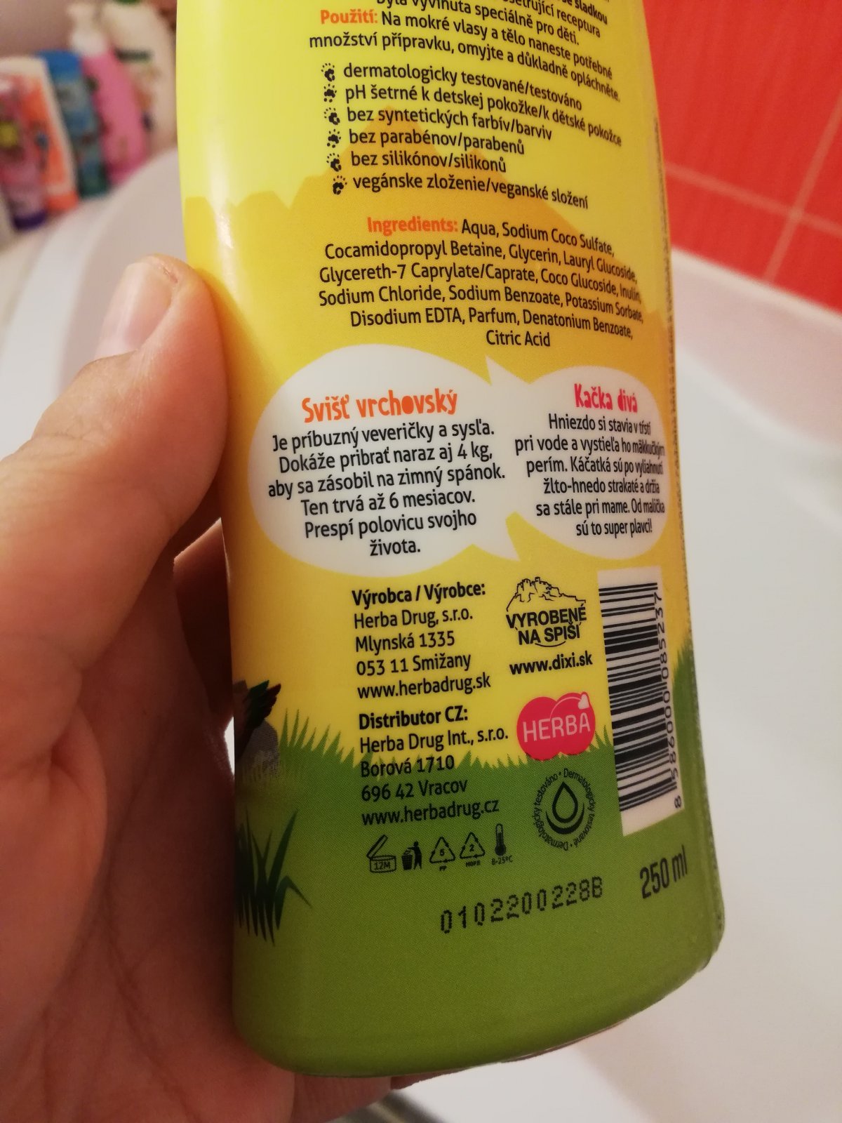 A tiež sme si prečítali aj na zadnej časti niečo o zvieratkách, čo je tiež veľké plus, pretože ja osobne som sa s tým ešte nestretla a kupujeme veľmi veľa výrobkov detských sprchových gélov rôznych značiek 🙈